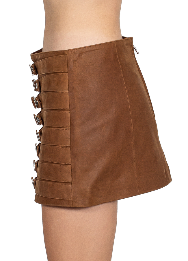 - Шкіряна міні спідниця, ремінці спереду, ззаду застібка-блискавка