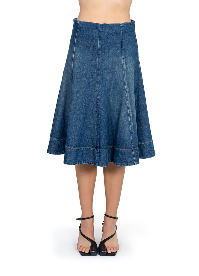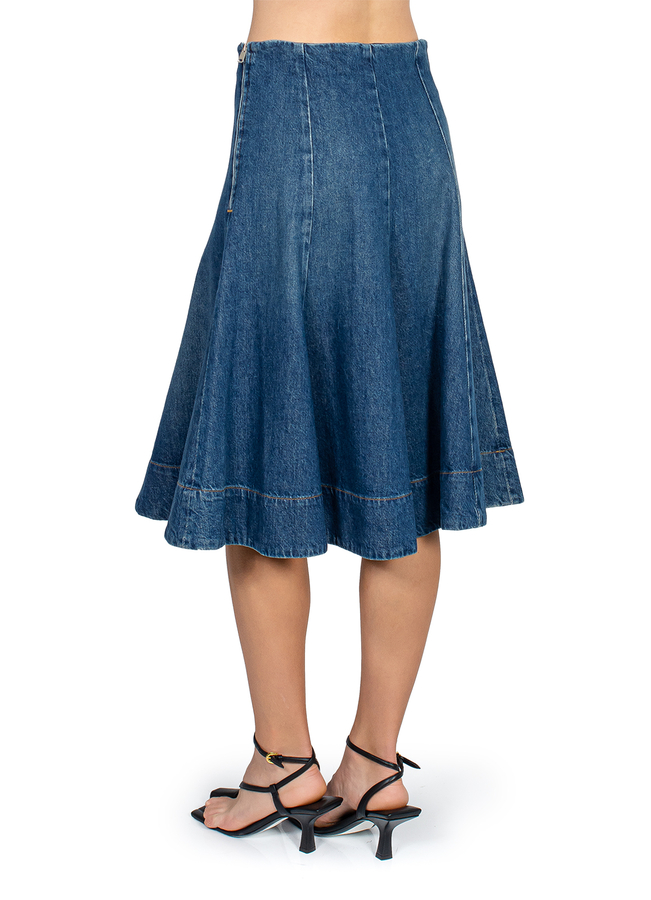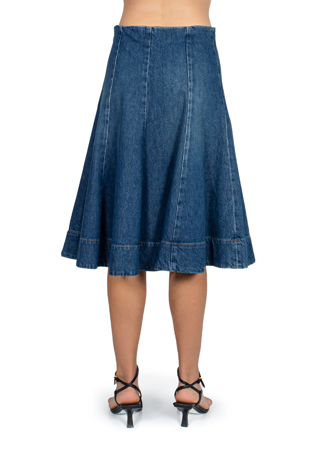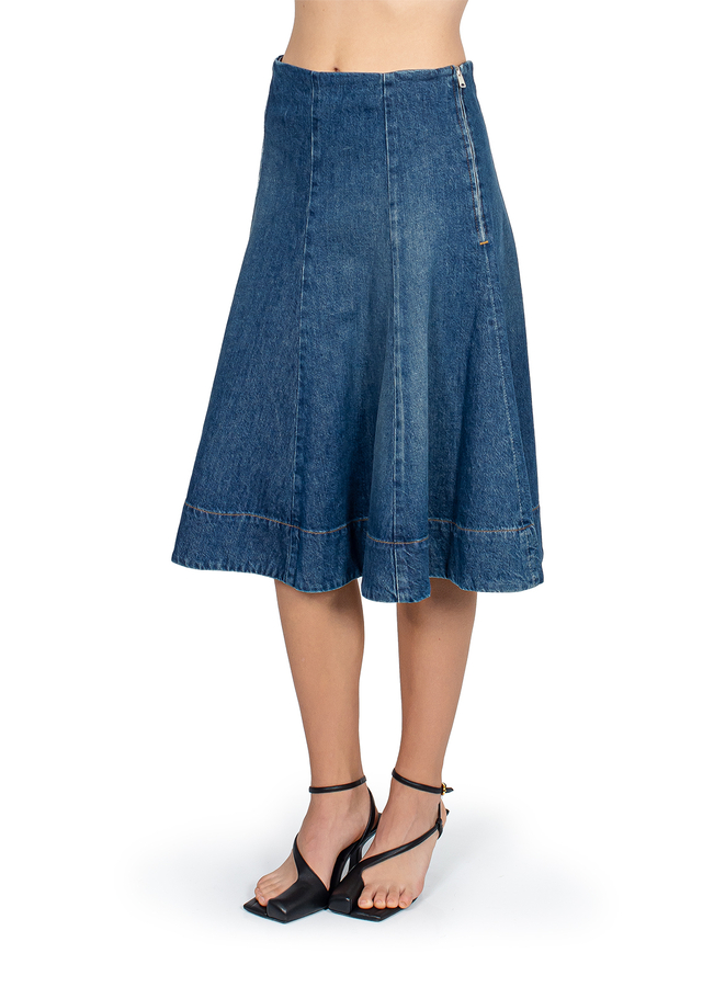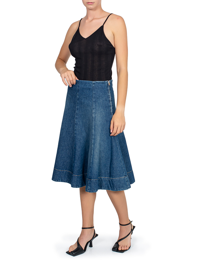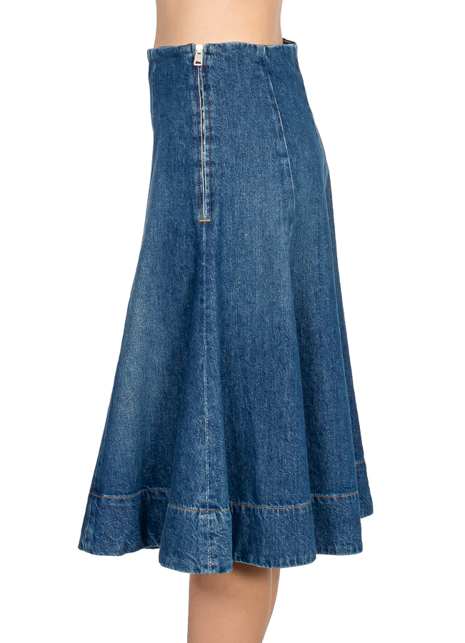 - Джинсова спідниця, розклешений низ, збоку застібка-блискавка