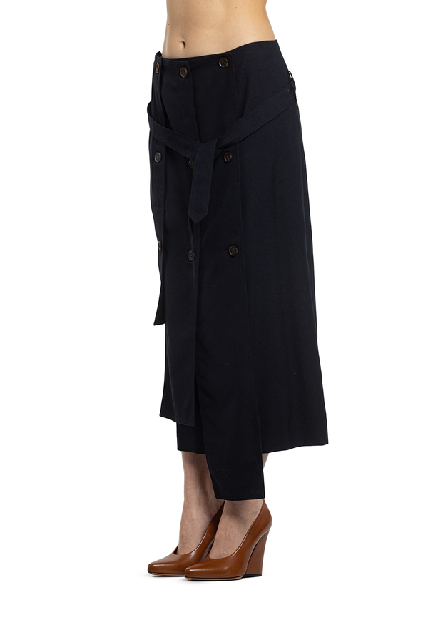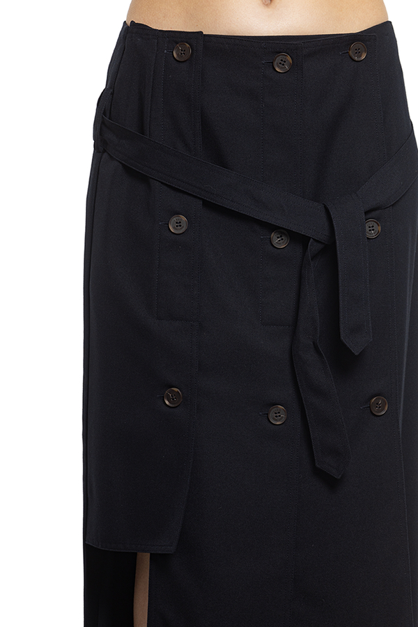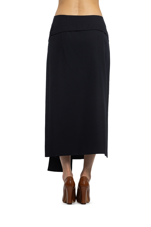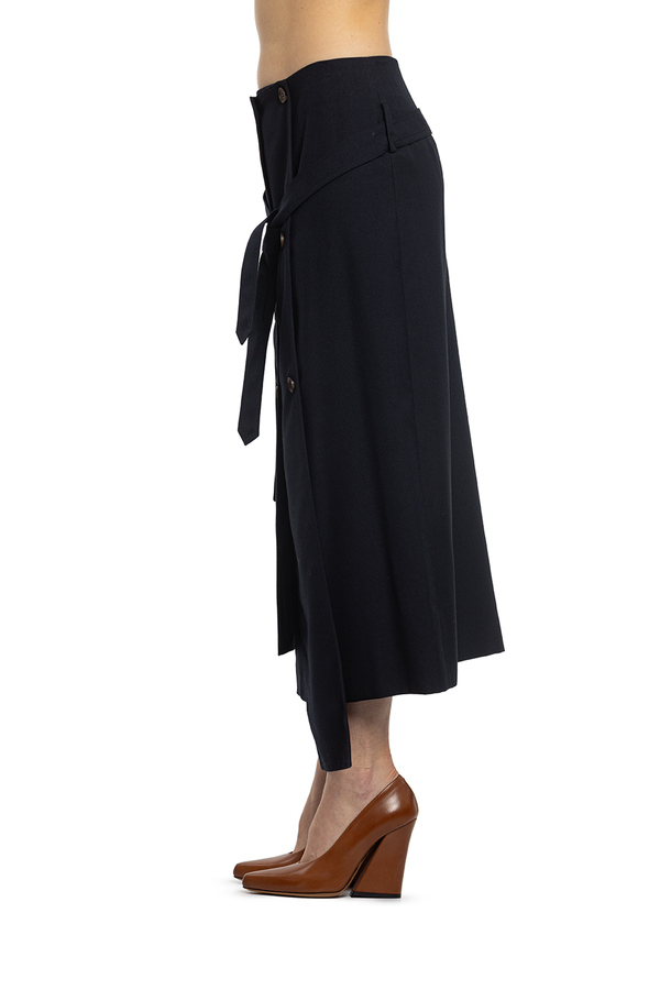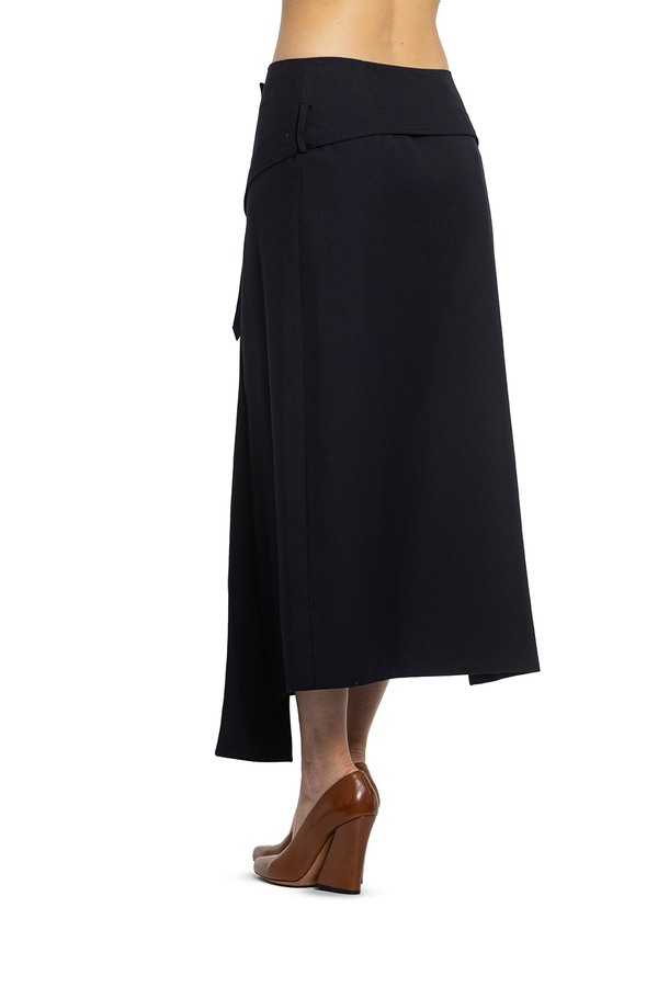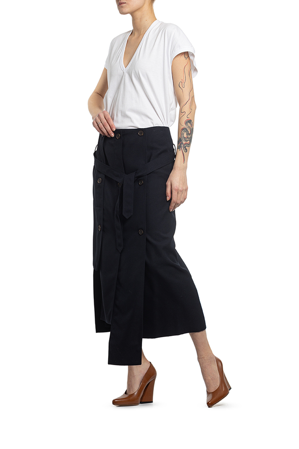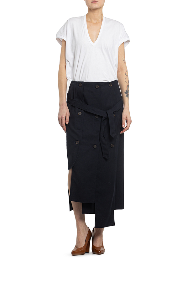 - Асиметрична спідниця на ґудзиках, асиметричного фасону, високої посадки, на поясі. Застібка спереду.
