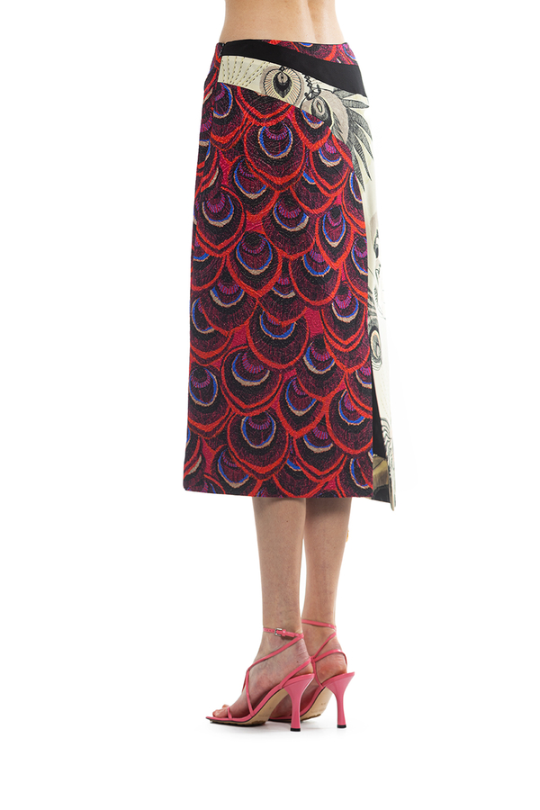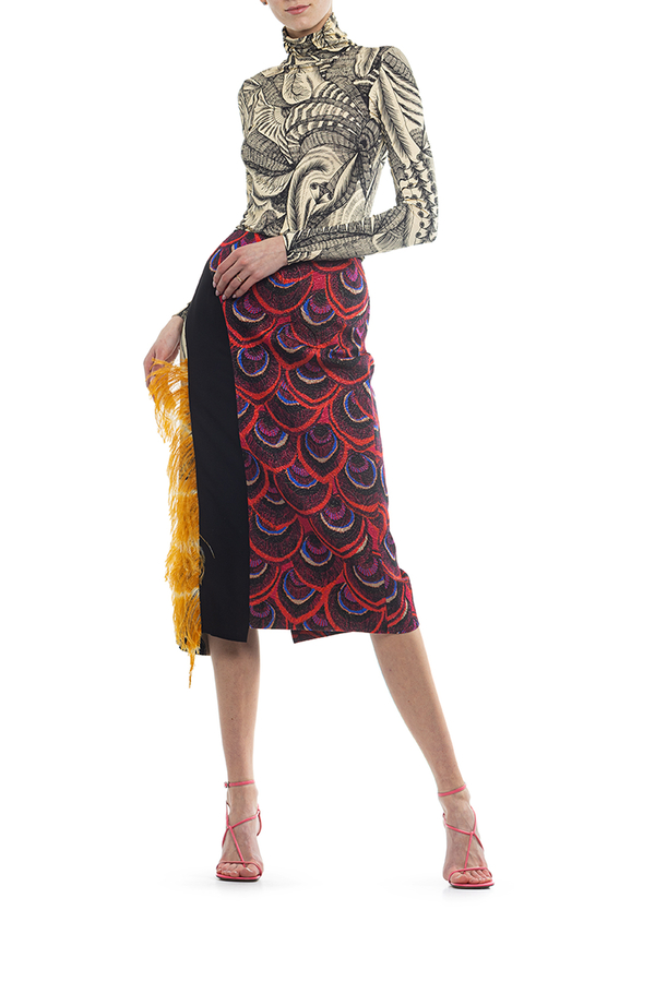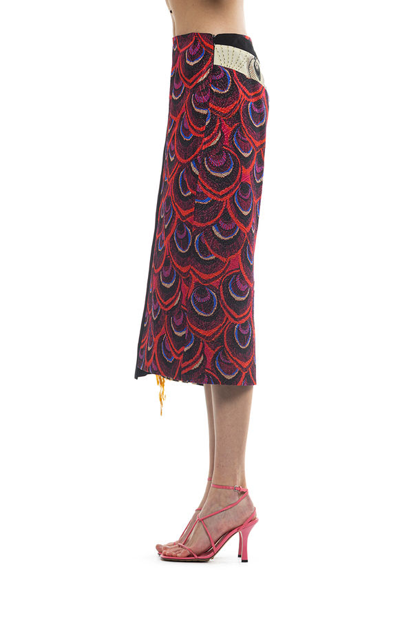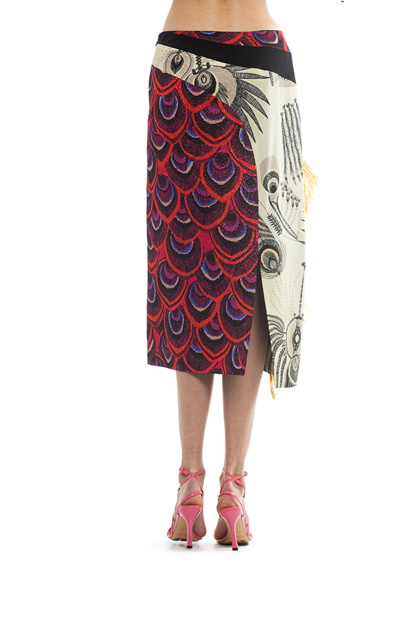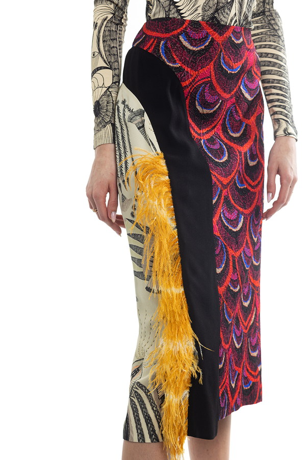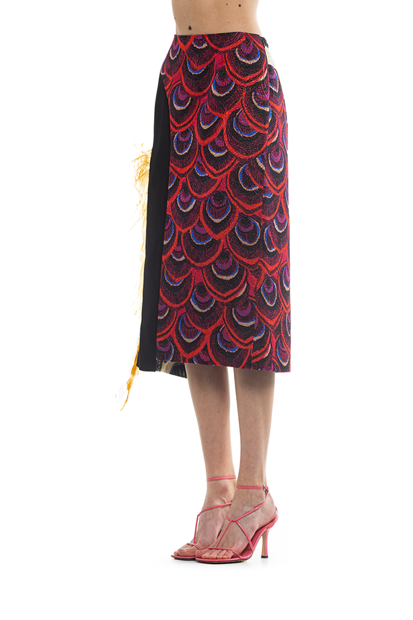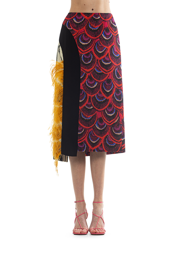 - Спідниця середньої довжини з трьохкольорової тканини. Прикрашена жовтим пір'ям.