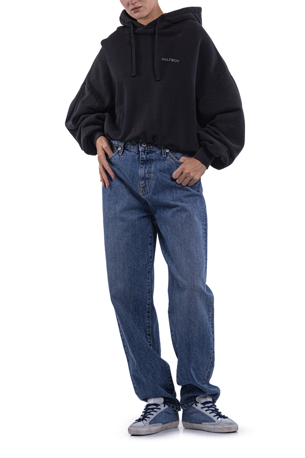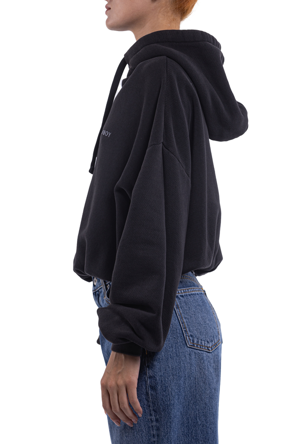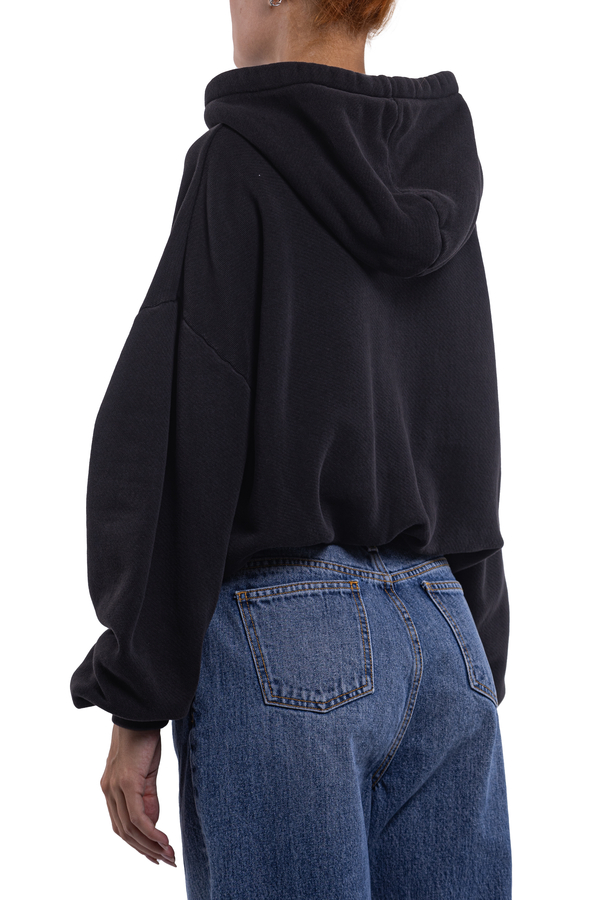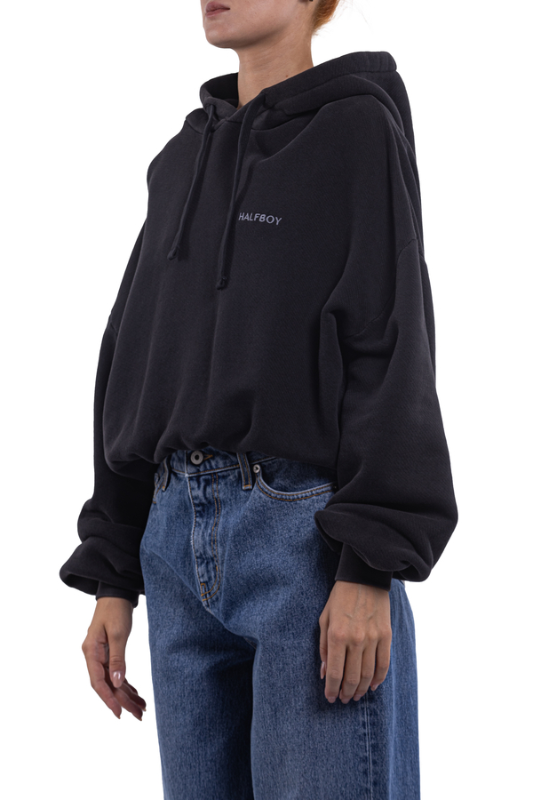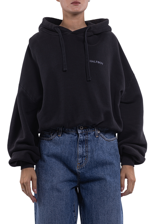 - Худі вільного крою із заниженими плечима, капюшон на кулісі, спереду напис із назвою бренда