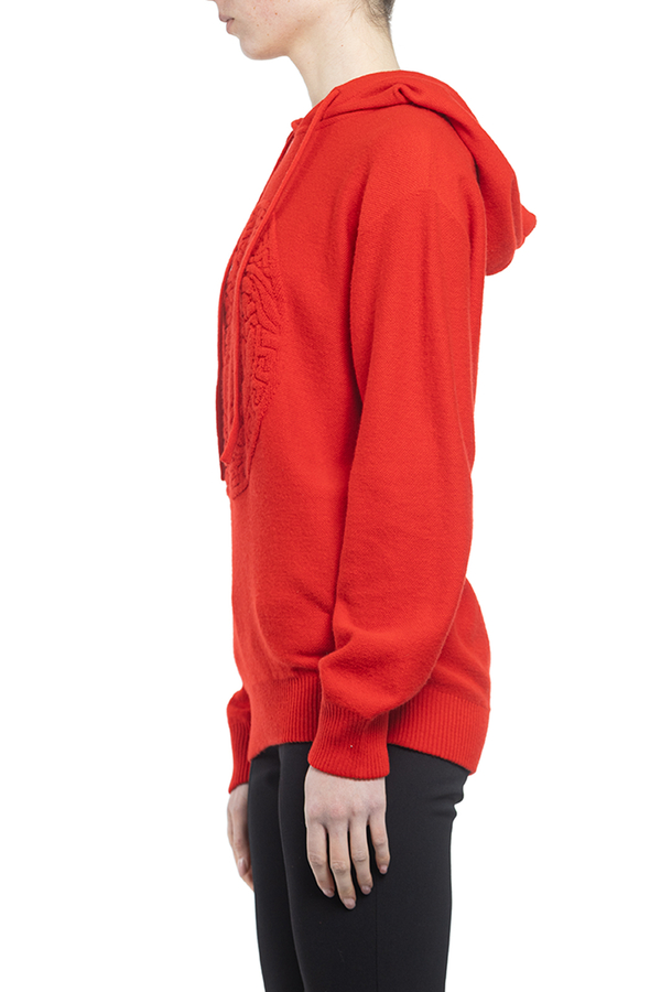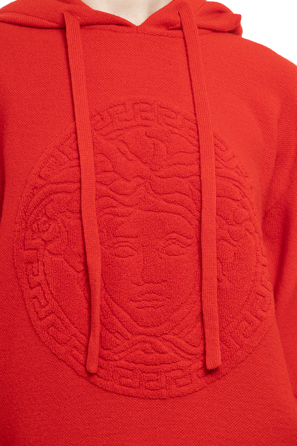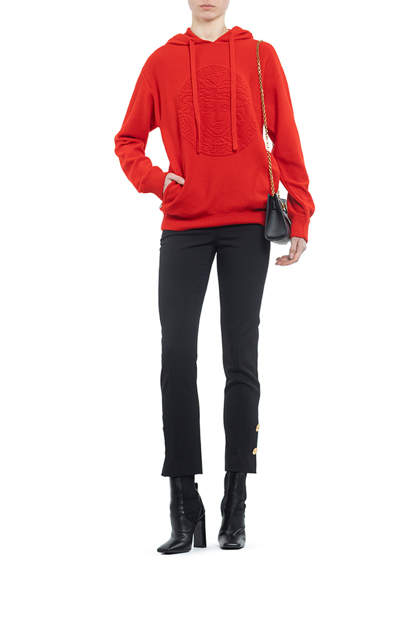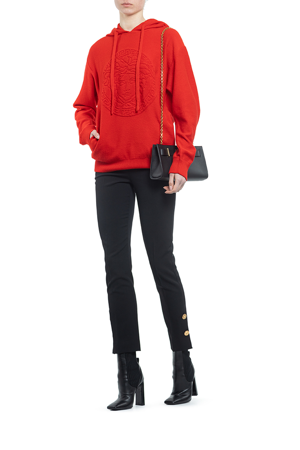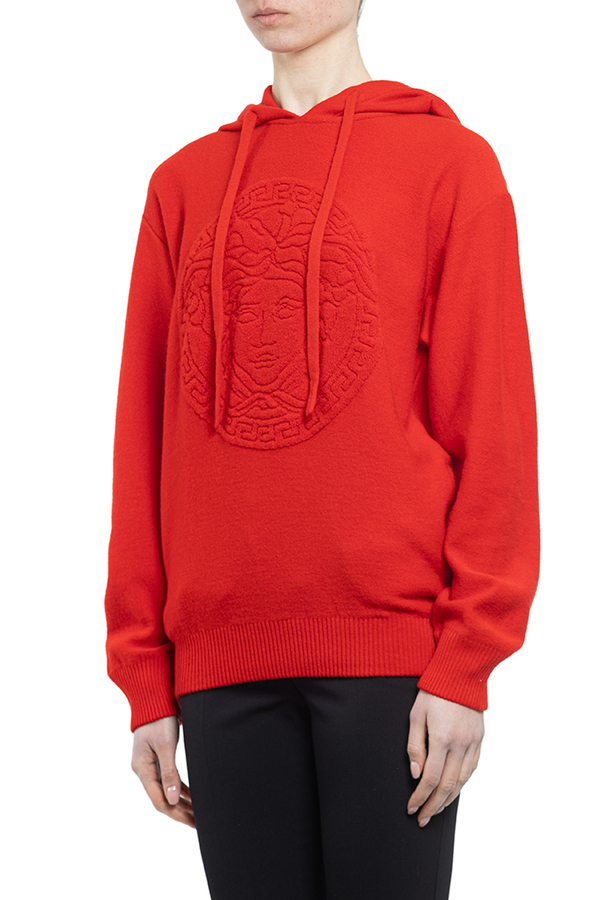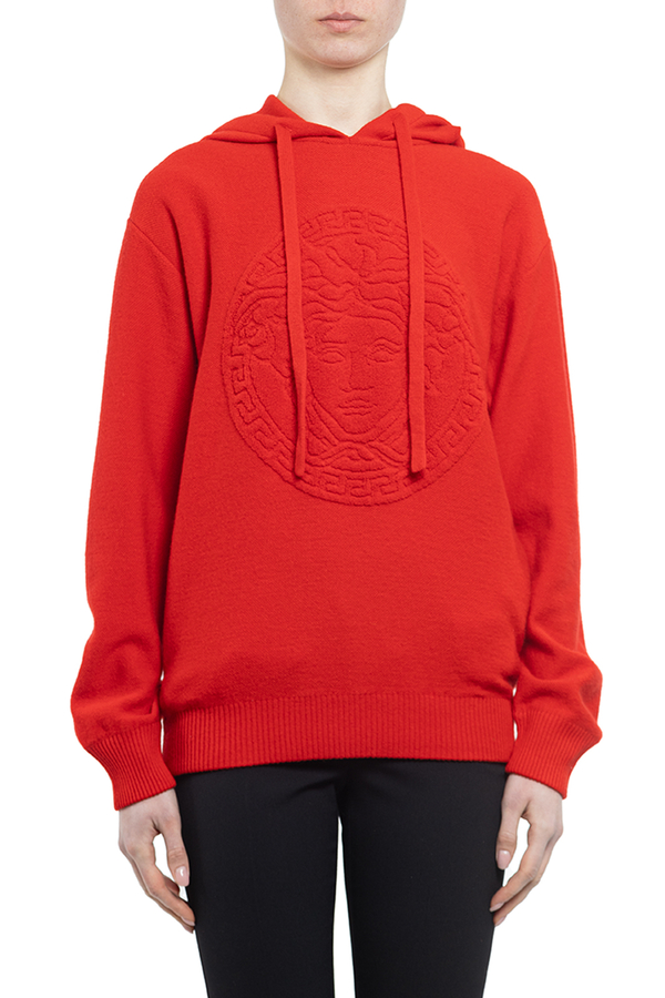 - Худі з плюшевим ефектом з м'якої вовни та кашеміру. Кишені з боків, куліска в капюшоні, великий тиснений декор Medusa у тон.