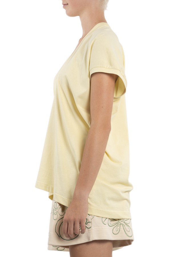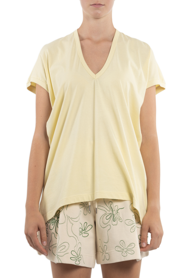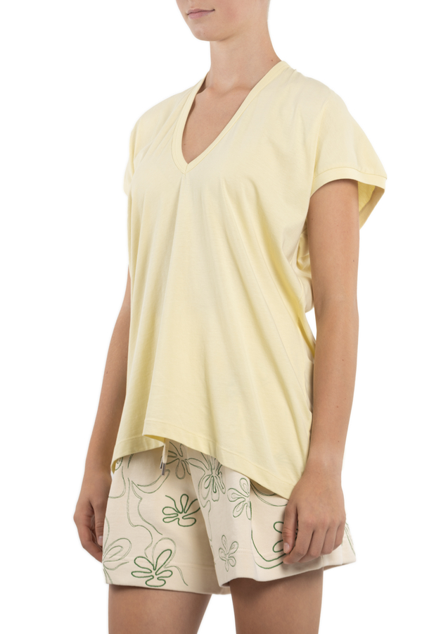 - Футболка з V-вирізом, короткі рукави, подовжена ззаду