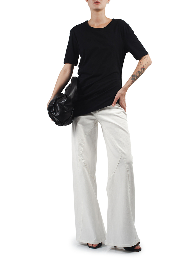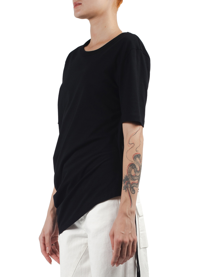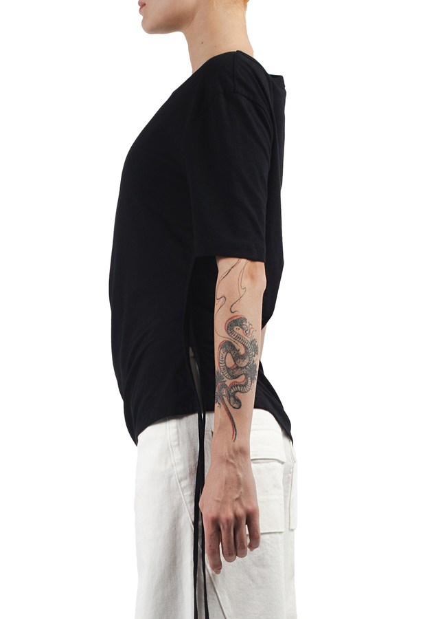 - Футболка з короткими рукавами, круглий виріз, асиметричний низ, збоку зав'язка