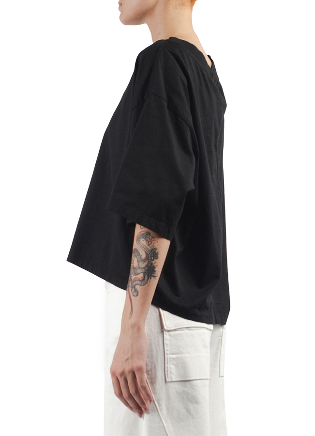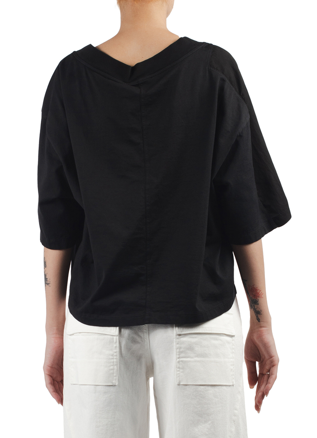 - Футболка з короткими широкими рукавами, V-образний виріз, еластична горловина, подовжена ззаду