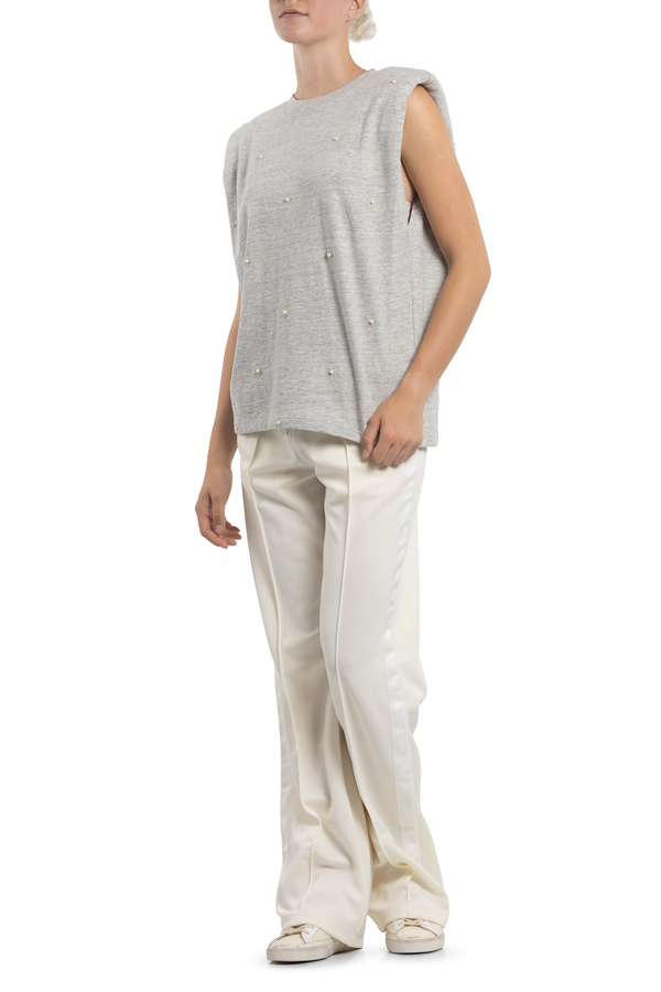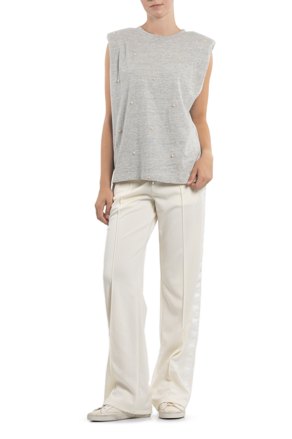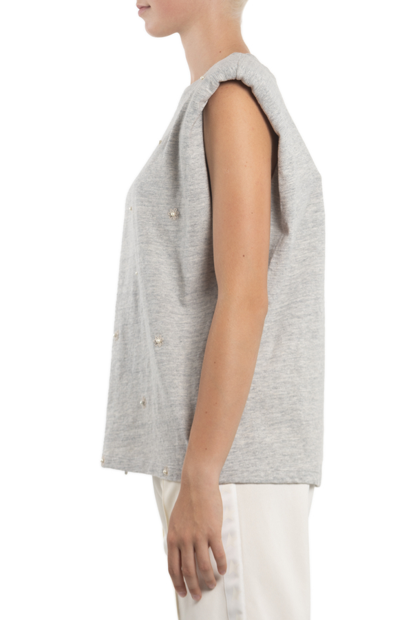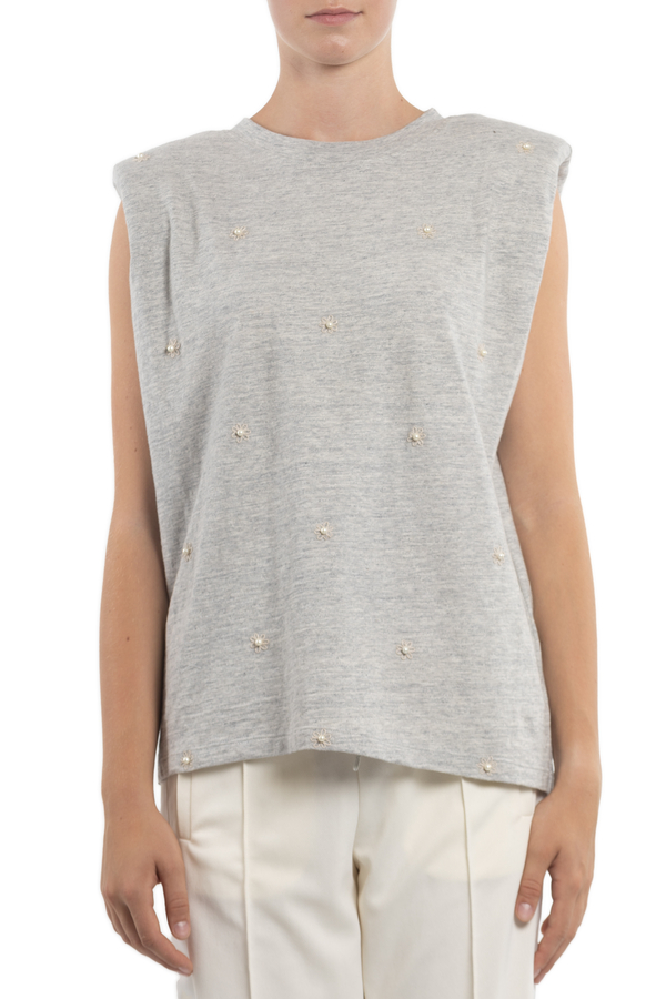 - Футболка без рукавів з наплічниками, кругла горловина, квіткова вишивка спереду, деталі зі штучних перлів