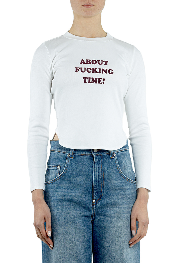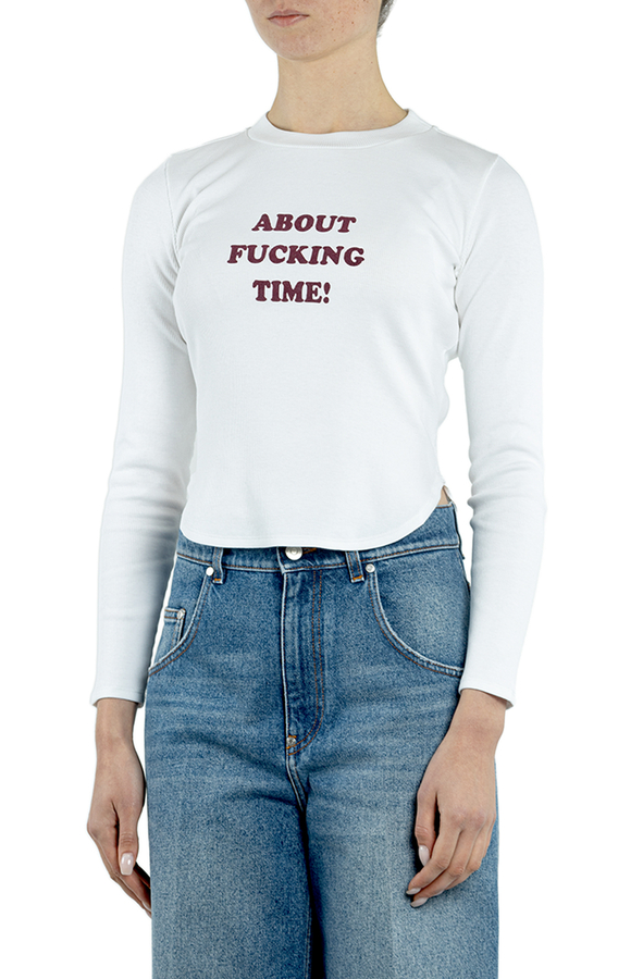 - Футболка з довгими рукавами в дрібний рубчик, кругла горловина, принт з написом спереду, короткі заокруглені розрізи з боків