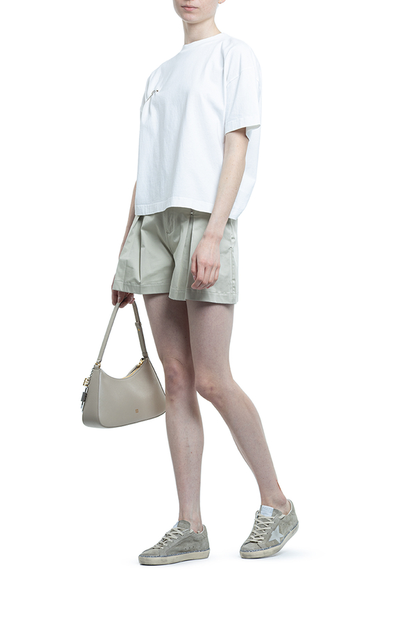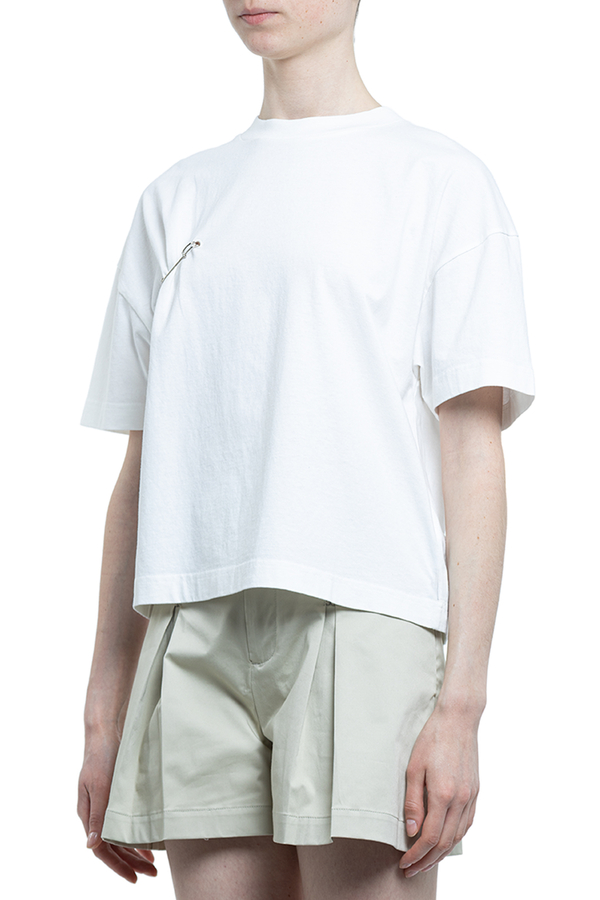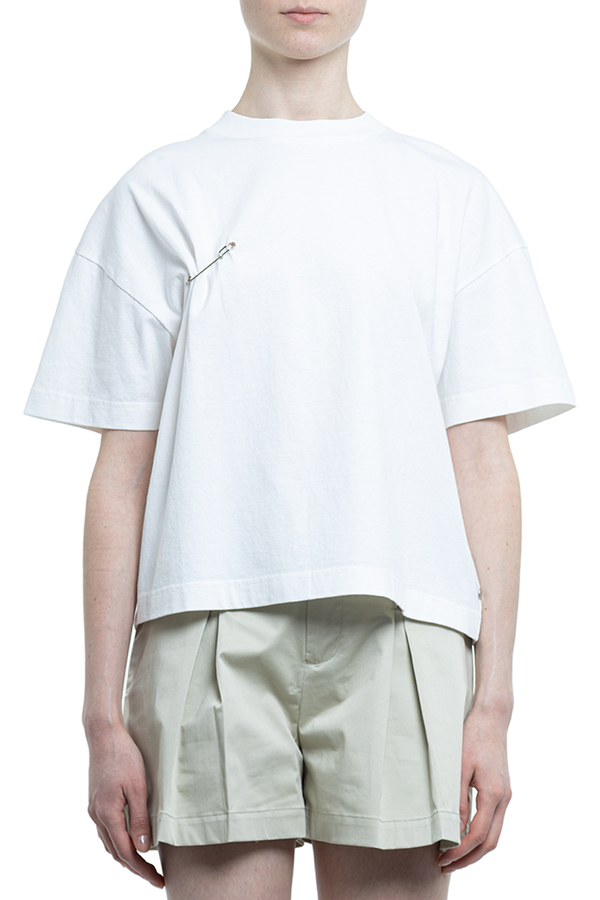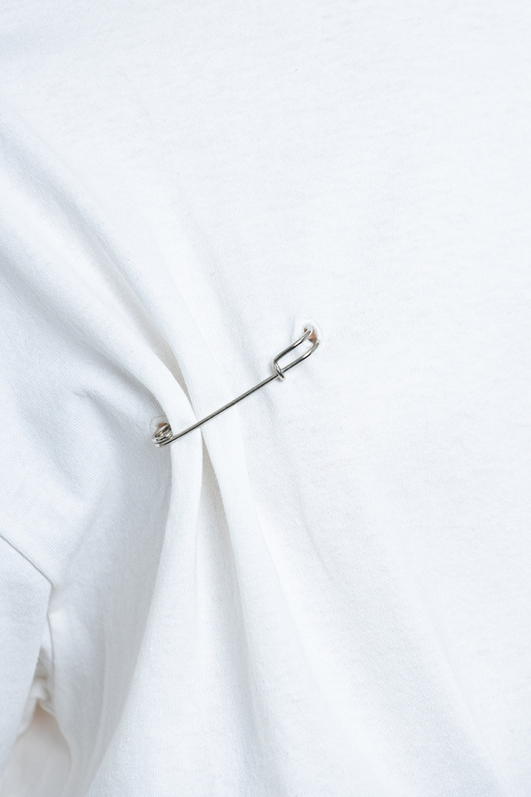 - Футболка вільного крою, занижена лінія плечей, круглий виріз горловини, декор-булавка на грудях, нашивка з логотипом ззаду