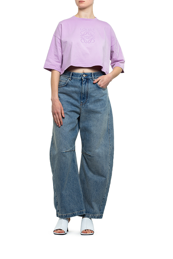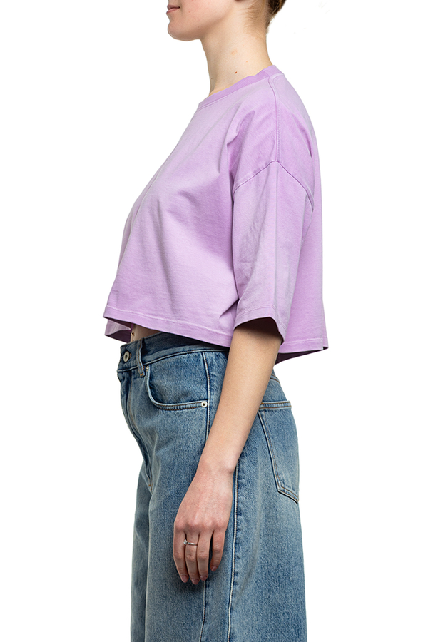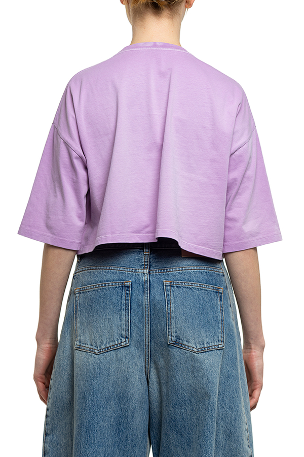 - Укорочена футболка вільного крою, круглий виріз горловини, занижена лінія плечей, вишивка логотипу на грудях
