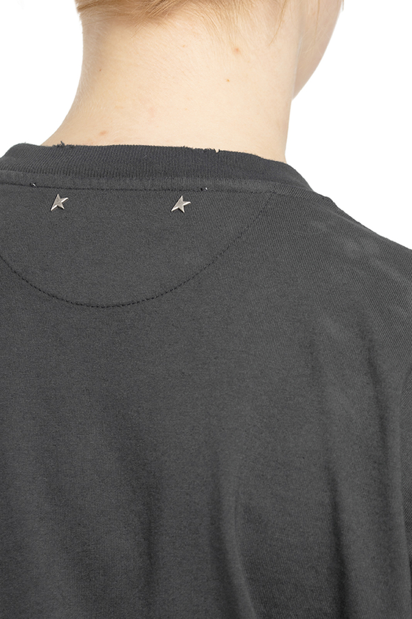 - Футболка з короткими рукавами, круглий виріз горловини, прикрашений штучними кристалами, необроблені краї, подвійна золота зірка на спині