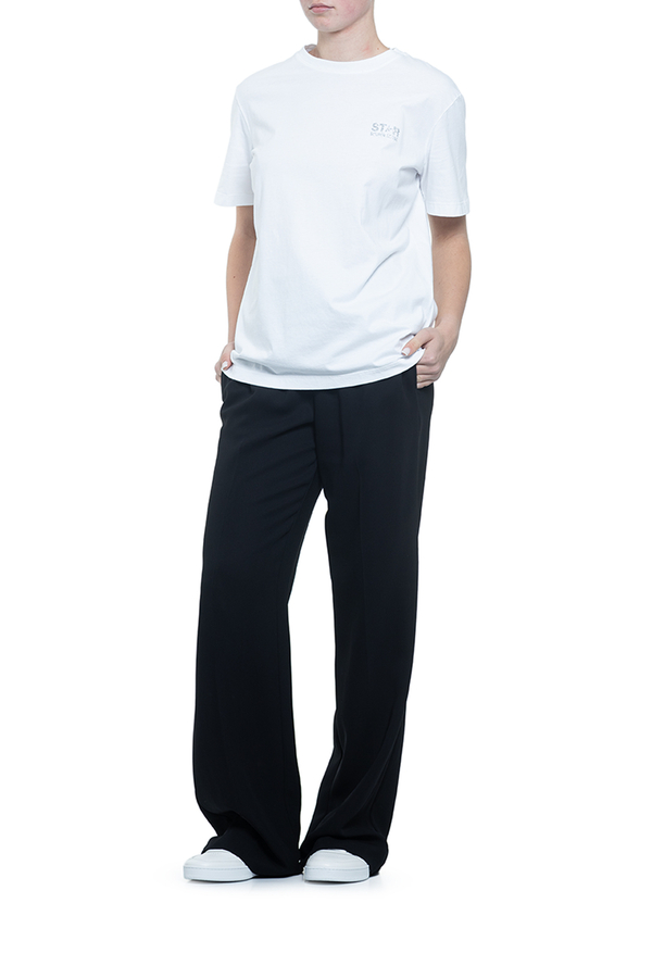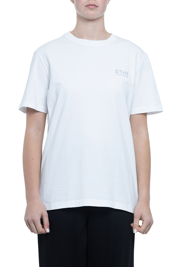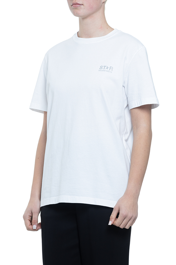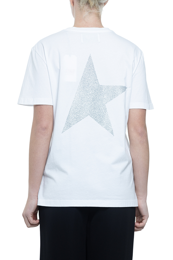 - Футболка з короткими рукавами, круглий виріз горловини, срібний блискучий логотип спереду, макси-зірка зі срібним блиском на спині