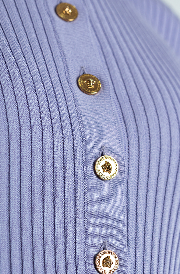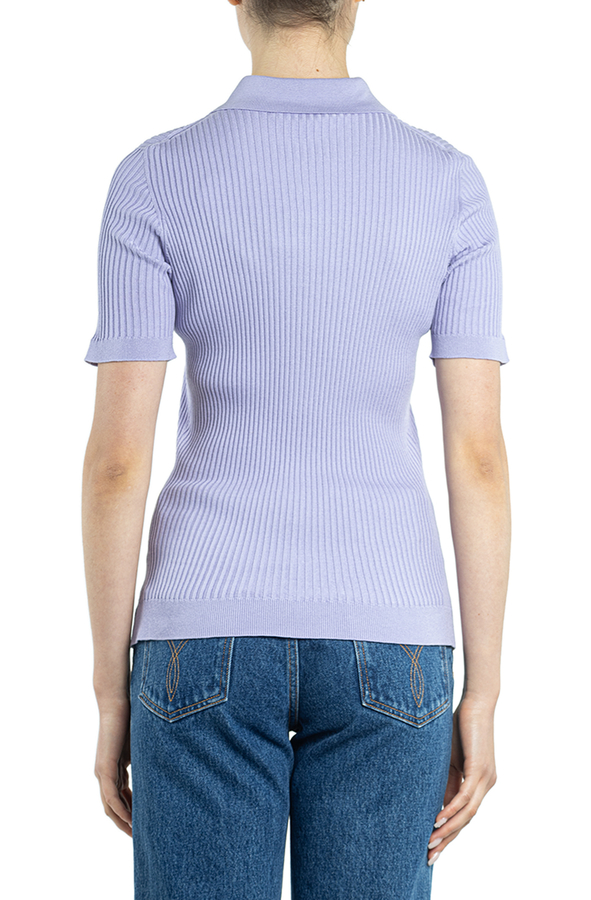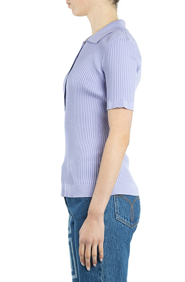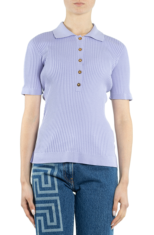 - Топ із короткими рукавами, застібка на ґудзиках спереду, комір поло та прямий поділ.