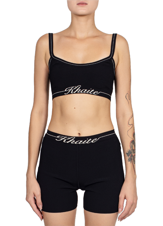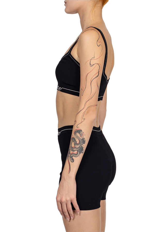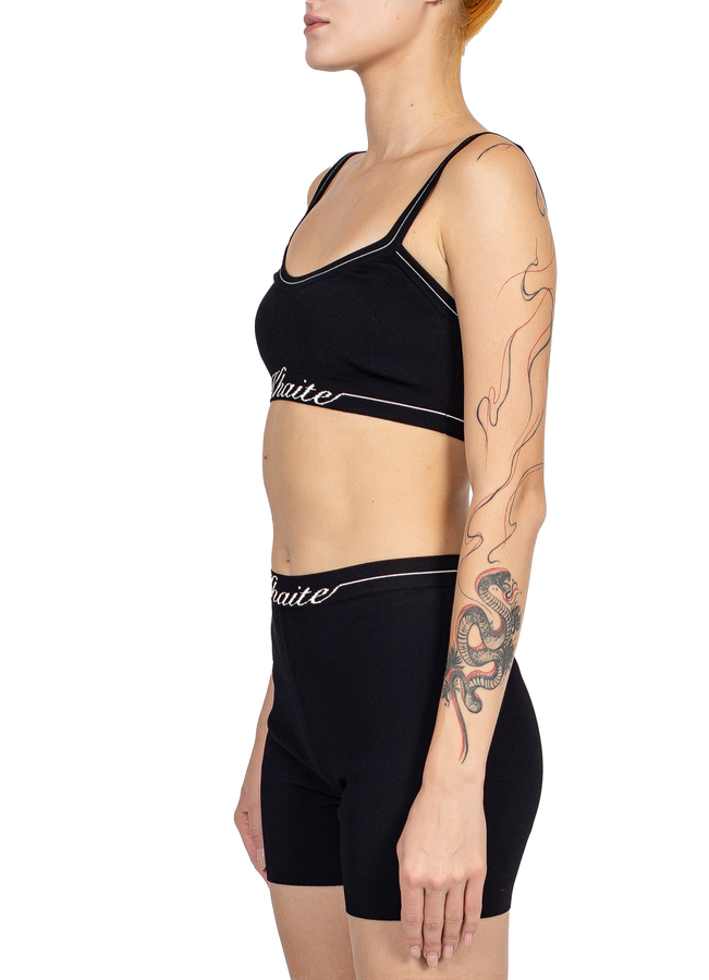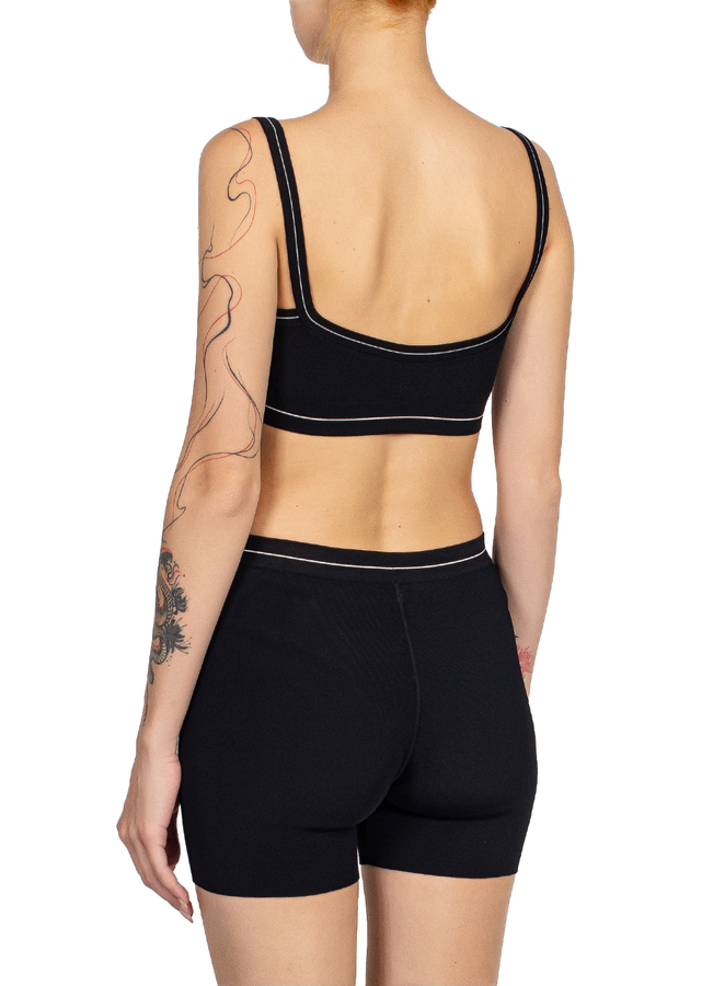 - Топ Carmelo з еластичної тканини на тонких брителях і круглим вирізом. Знизу на еластичному поясі з логотипом, короткої довжини.