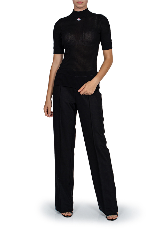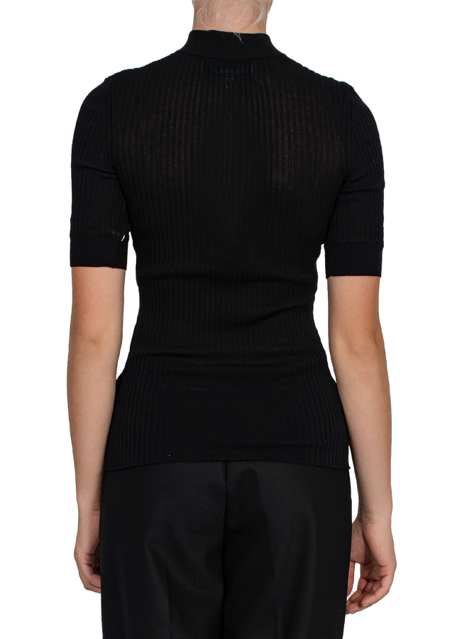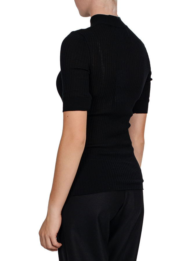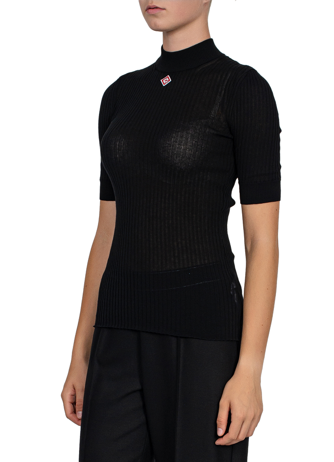 - Трикотажний топ в рубчик, комір-стійка, короткі рукави, нашивка з логотипом на грудях