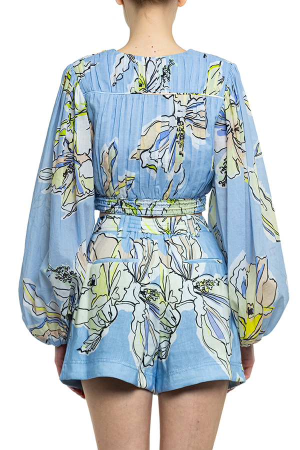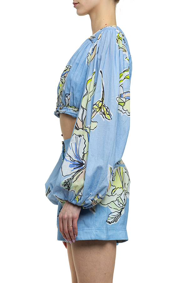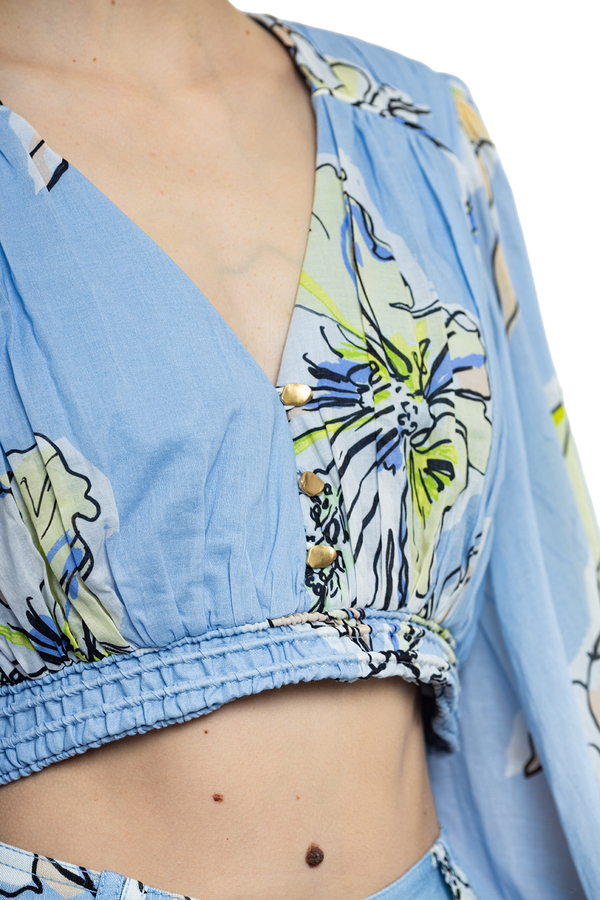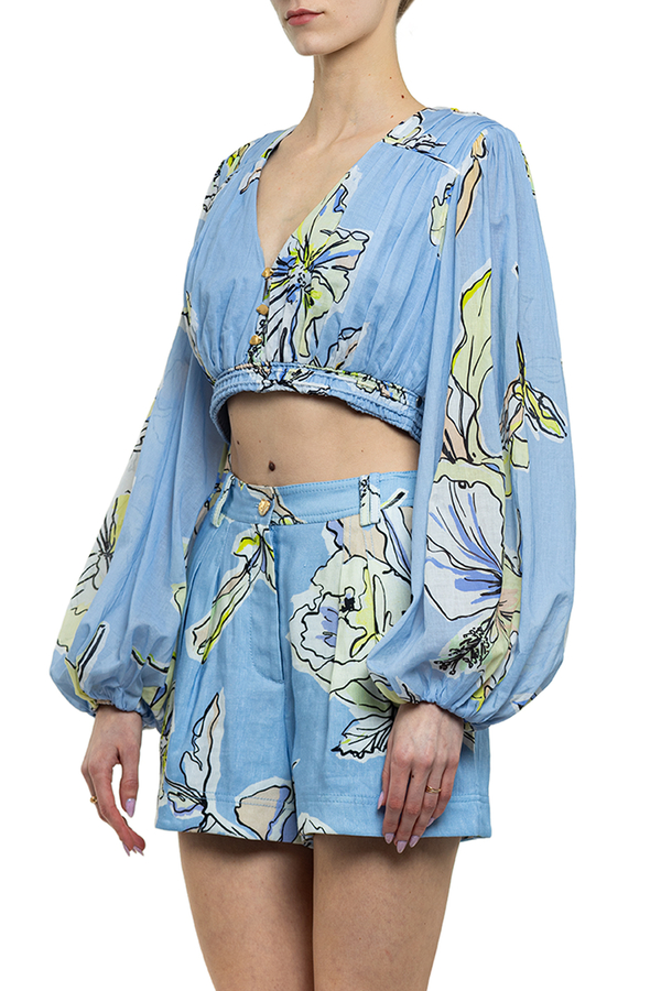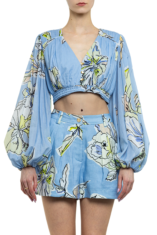 - Короткий топ із защипами, V-виріз спереду, еластичний низ, широкі рукави