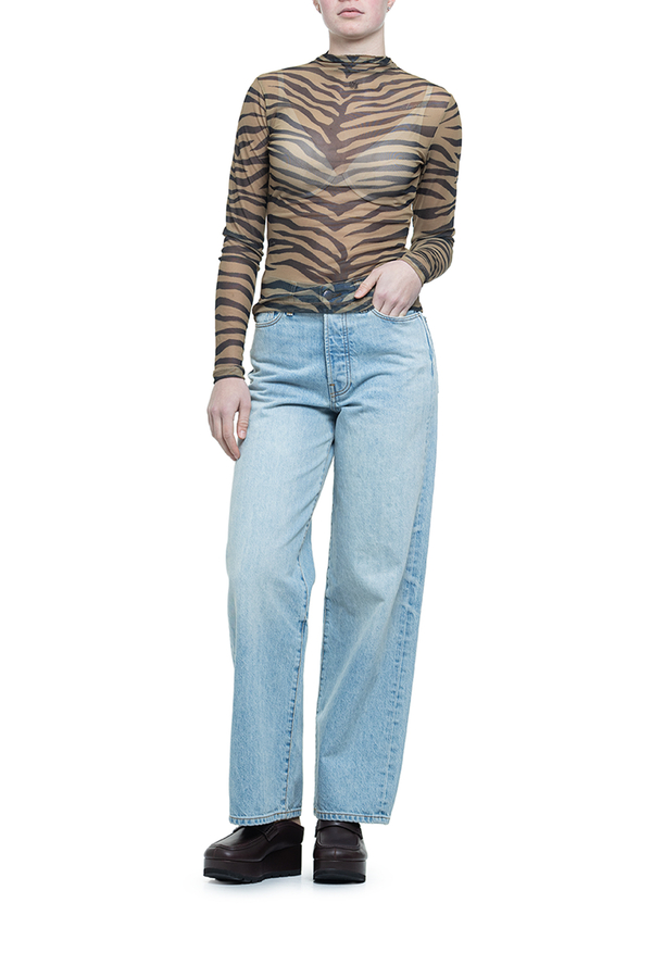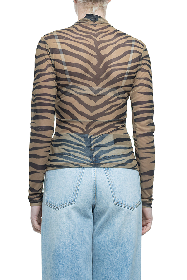 - Топ із зебровим принтом, довгі рукави, високий комір, вишивка монограми спереду