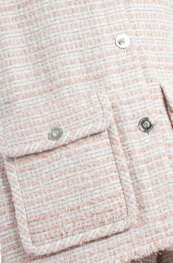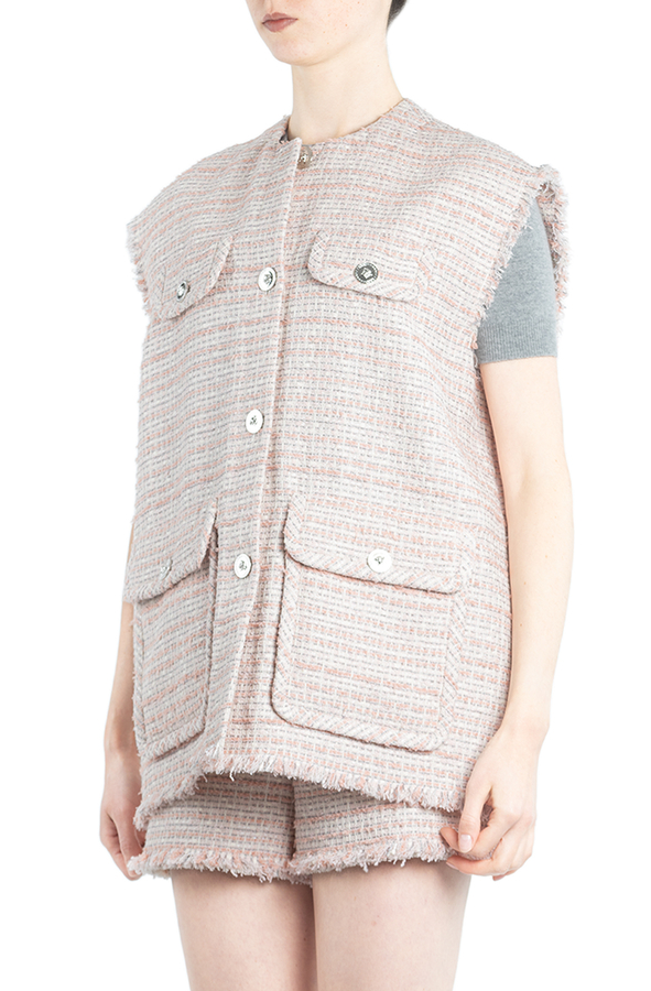 - Жилет з круглим вирізом горловини, спереду застібка на фірмові гудзики з головою Медузи, чотири передні кишені з клапанами, бахрома по низу