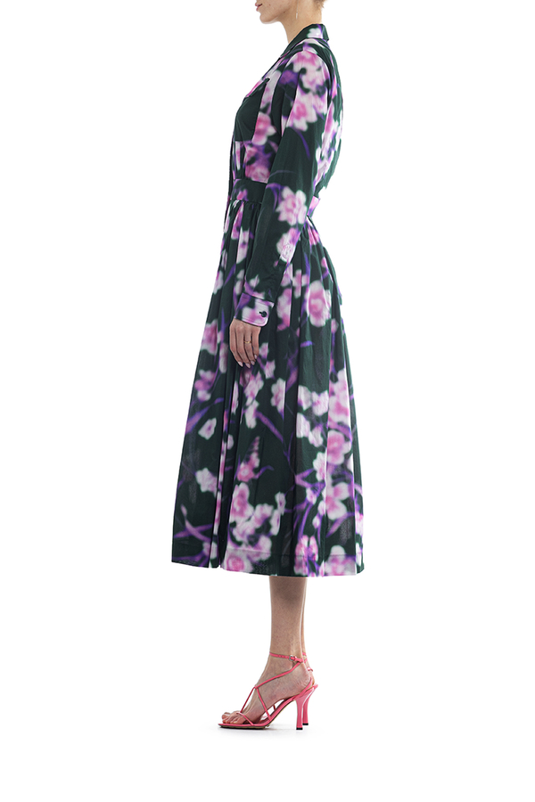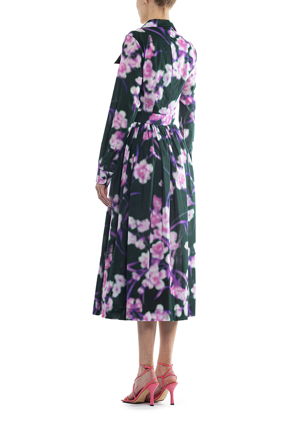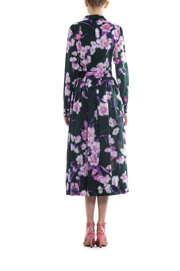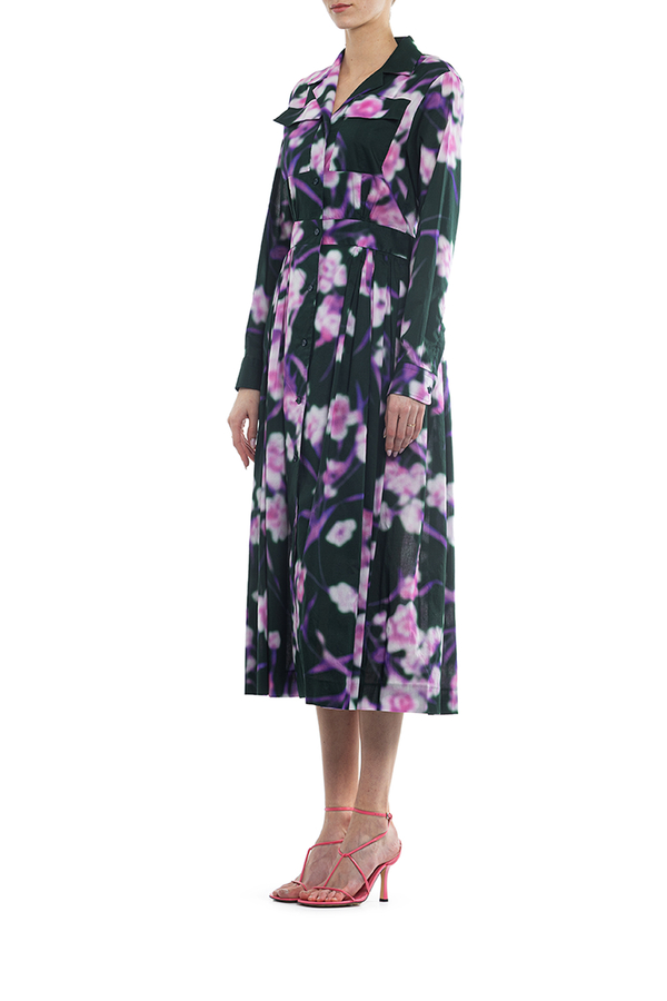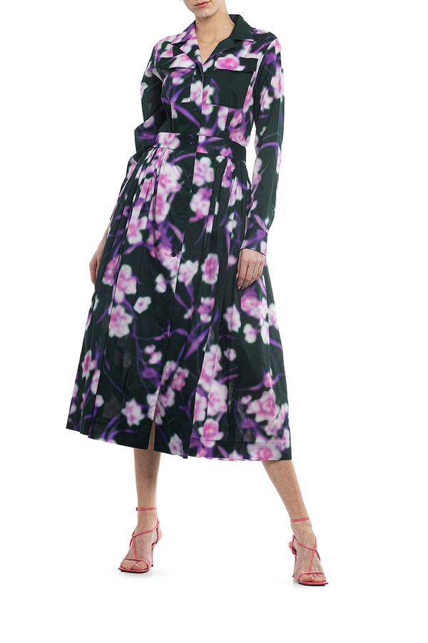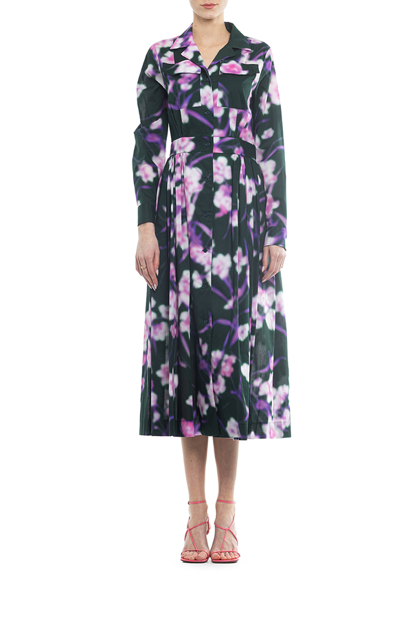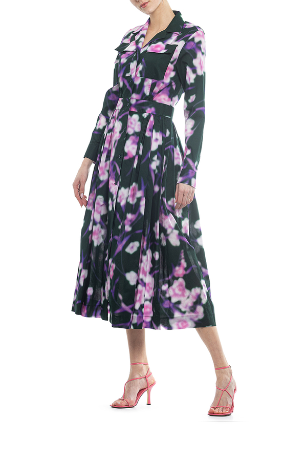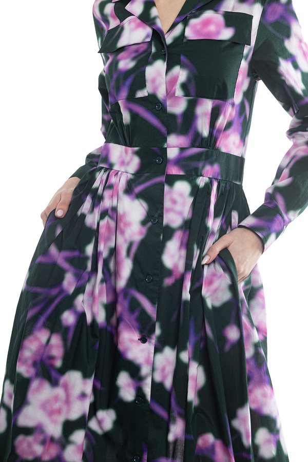 - Бавовняна сукня-сорочка з довгими рукавами. Застібка на гудзики спереду. Комір, манжети на ґудзиках, розмитий квітковий принт, дві кишені з клапанами на грудях, приталений дизайн, плісована спідниця А-силуету.