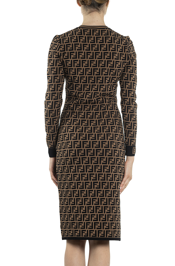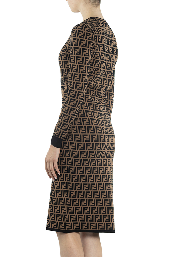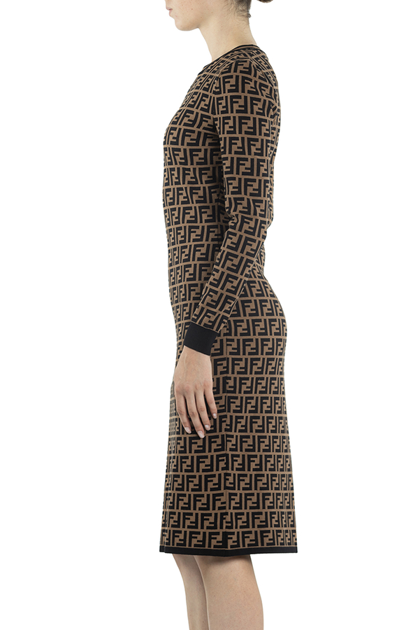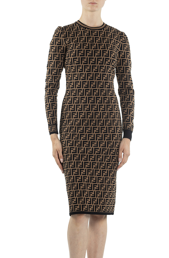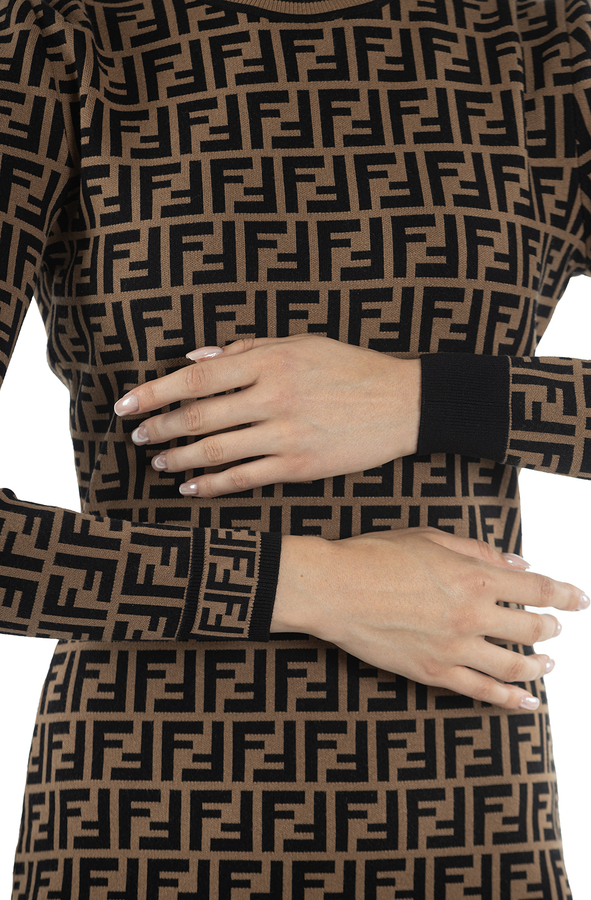- Трикотажка сукня середньої довжини з довгими рукавами. Патерн логотипів по всій поверхні. Круглий виріз горловини, еластичні манжети, приталений силует.