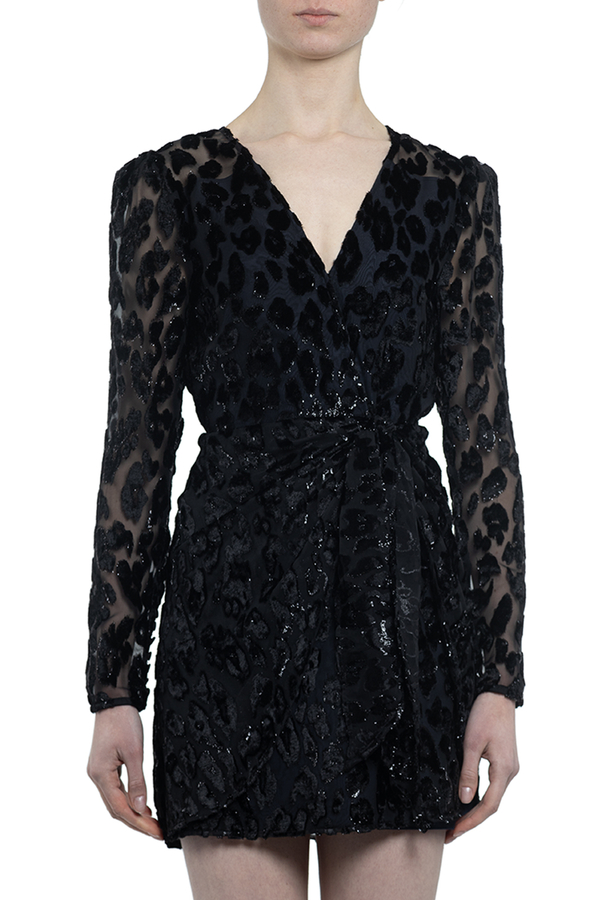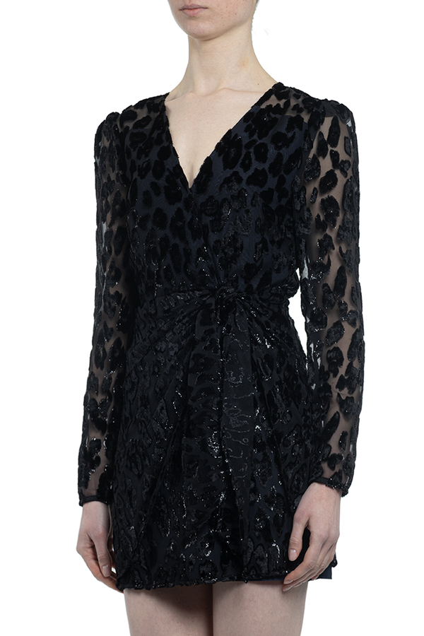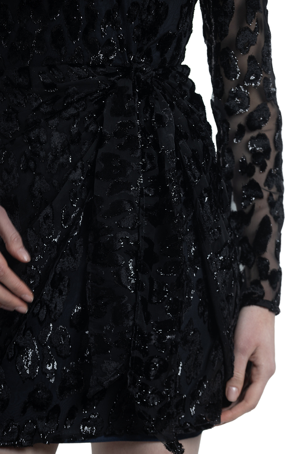 - Міні-сукня з напівпрозорої тканини з ефектним металевим візерунком леопардових цяток. З V-подібним вирізом. Довгі прозорі рукави. Відкрита спина з застібкою на гудзики. Прихована застібка на блискавці.