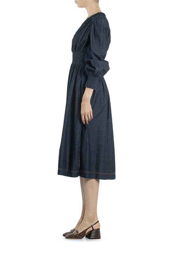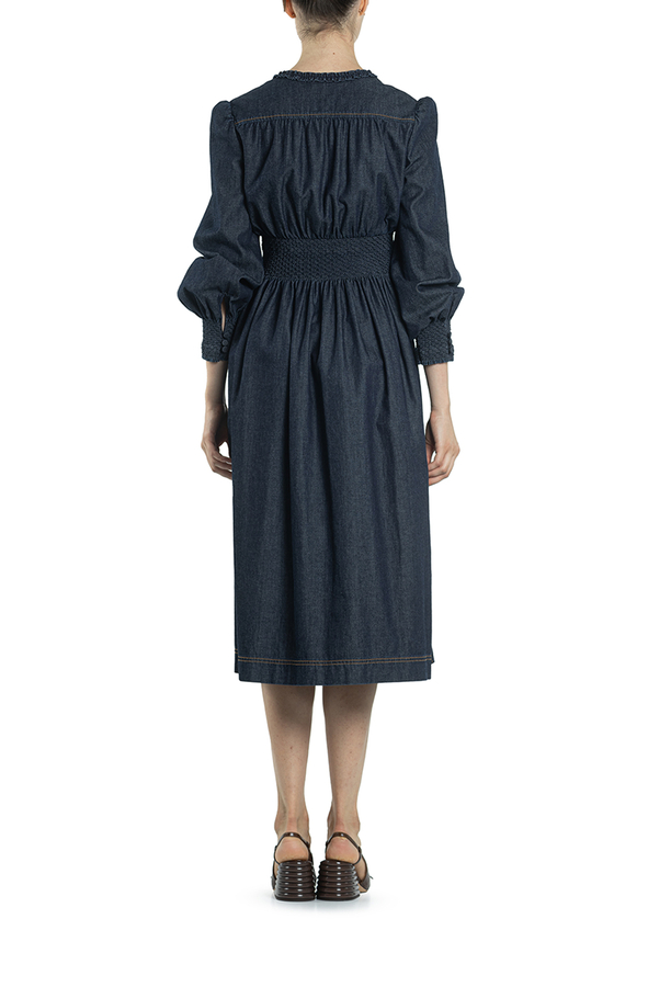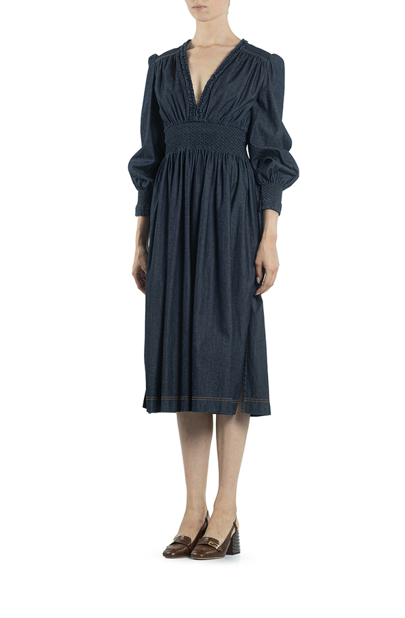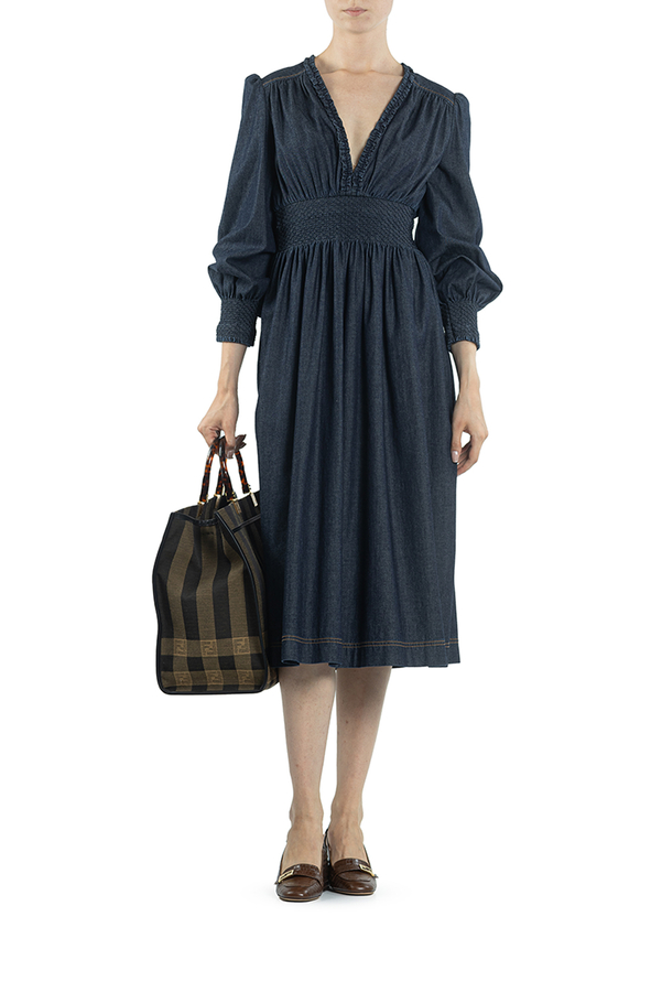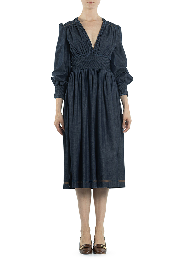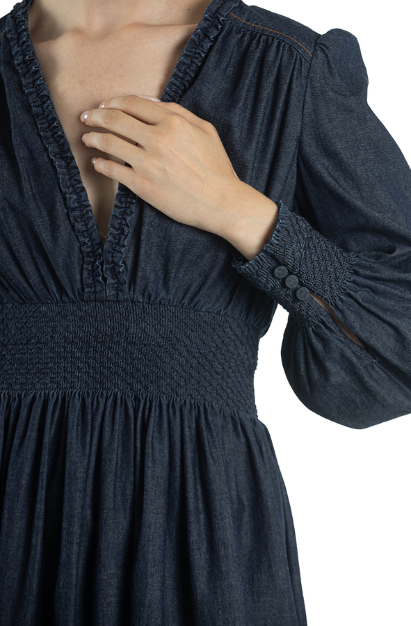 - Бавовняна сукня з довгими рукавами. V-подібний виріз, дрібні зборки на кокетці і манжетах, гудзики на манжетах, контрастні строчки.