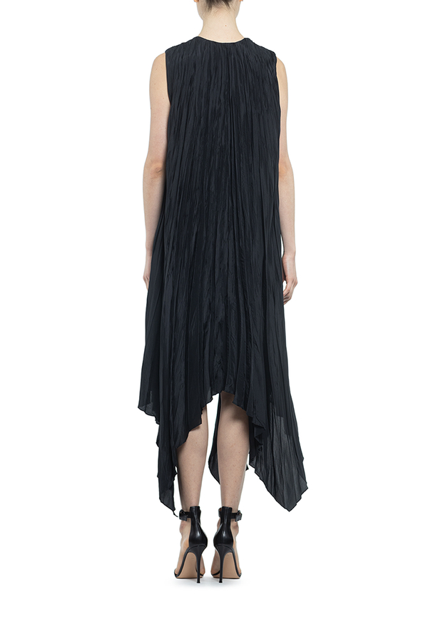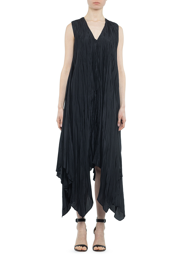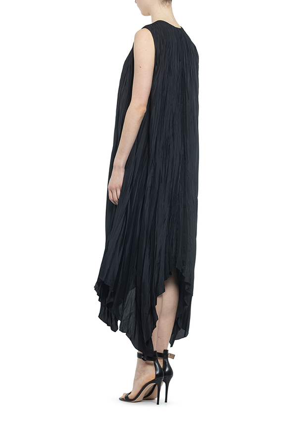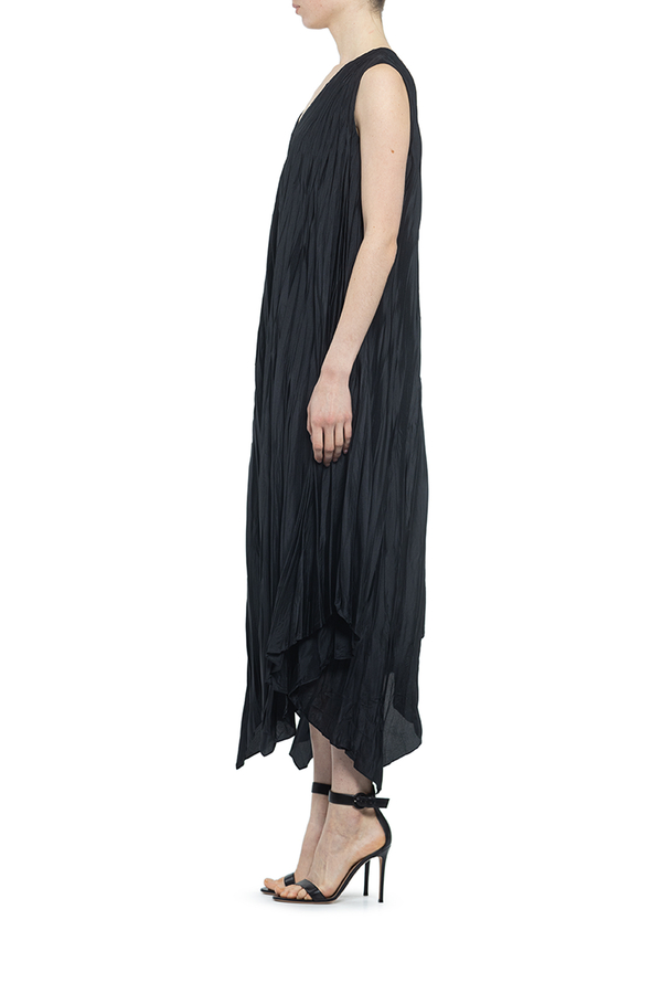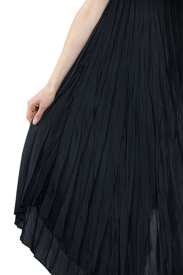 - Плісирована сукня з асиметричним подолом, без рукавів, V-подібний виріз, вільний крій