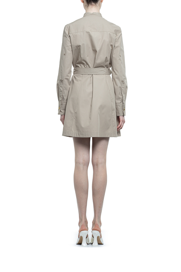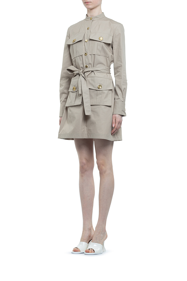 - Сукня з довгими регульованими рукавами, широкі манжети на гудзиках, защипи спереду, застібка та кишені з клапанами на гудзиках, золотиста фурнітура з емблемою логотипа