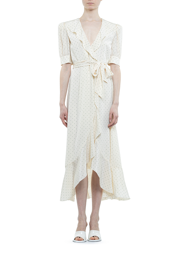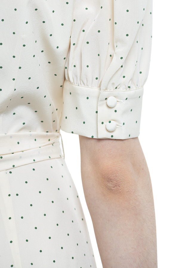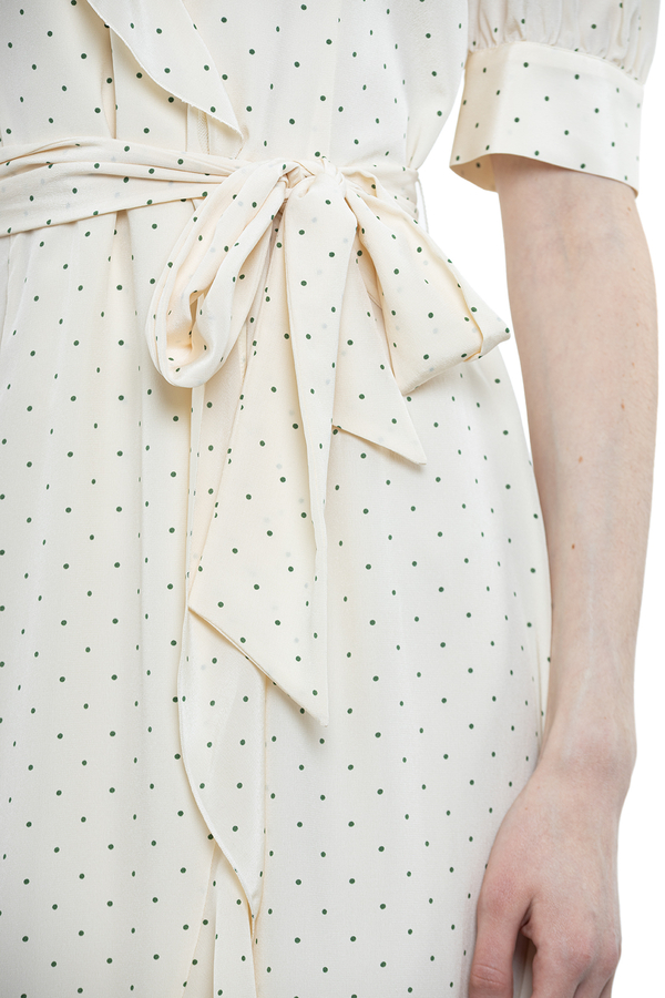 - Довга сукня з V-вирізом, короткі рукави з манжетами на гудзиках, пояс із зав’зкою, принт полька