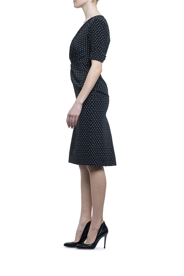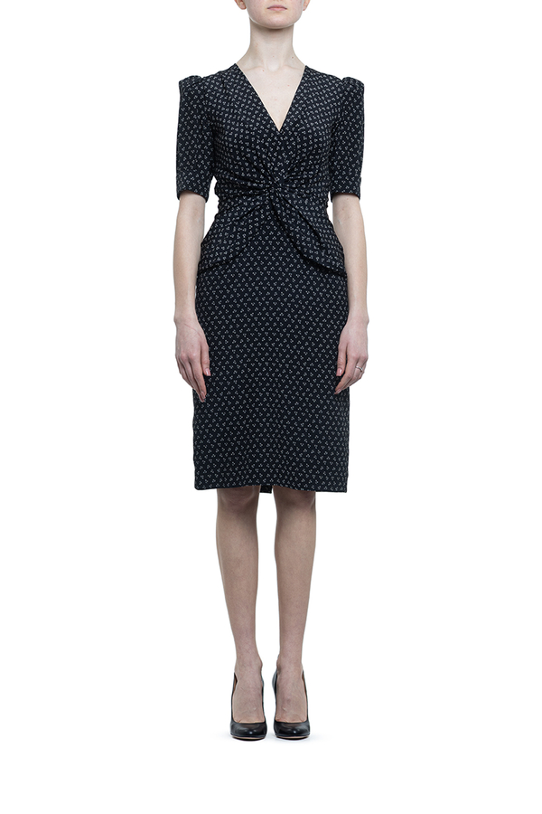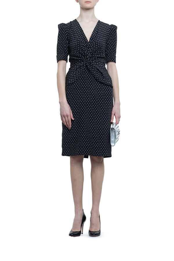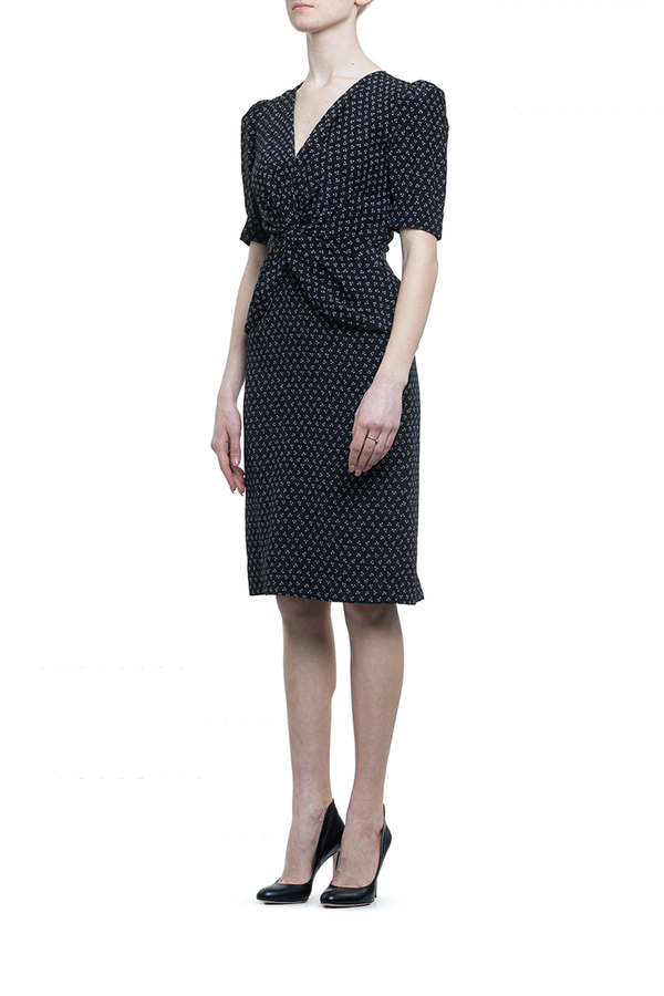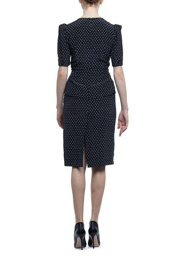 - Сукня з потайною застібкою-блискавкою ззаду, короткими рукавами-буфами, V-подібним вирізом
