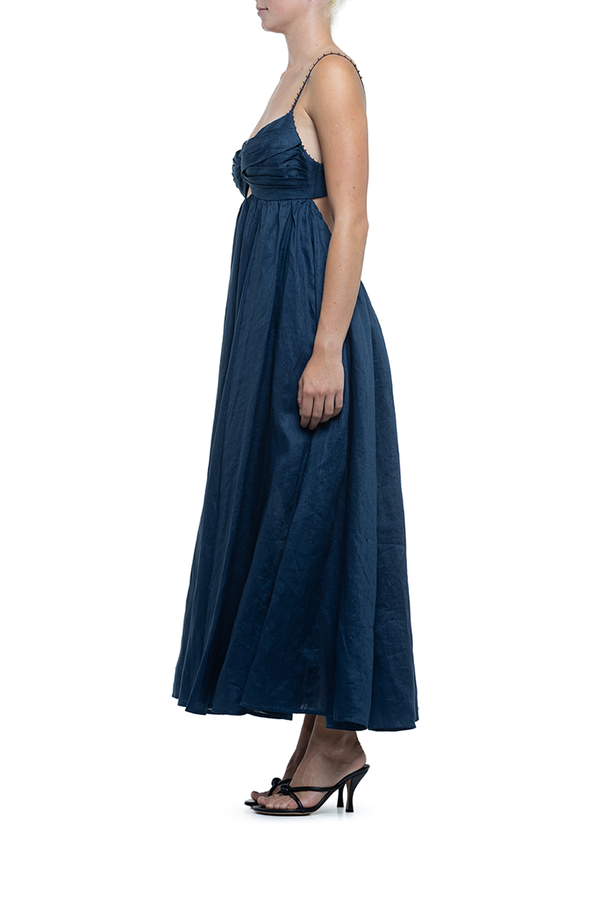 - Льняна сукня з вирізом серцем, декоративне скручування спереду, регульовані бретелі з дерев'яними намистинами, глибокий округлий виріз та призібрана резинка на спині із застібкою на гачки, потайна блискавка ззаду