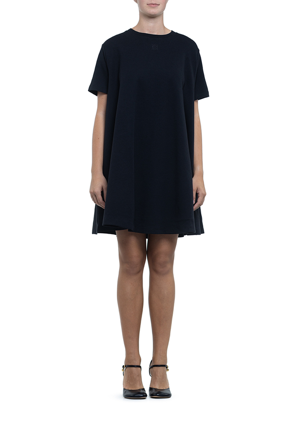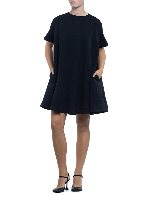 - Трапецієподібна сукня, вільний крій, круглий виріз горловини, короткі рукави, спереду вишивка логотипу, дві прорізні кишені у бічних швах