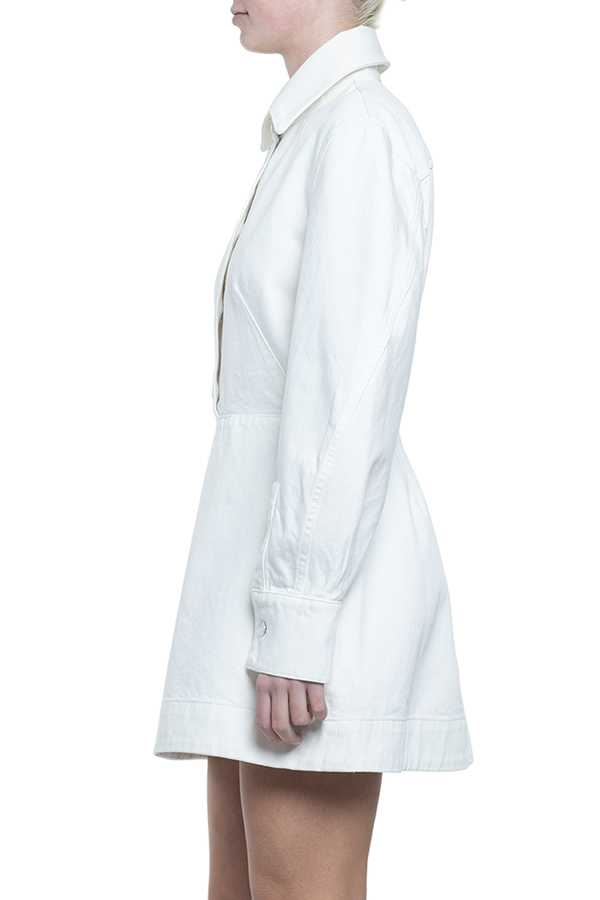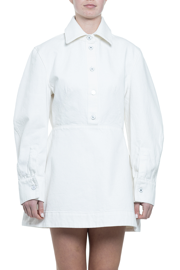 - Коротка сукня із щільного деніму без підкладки, довгі рукави, відрізна талія, прихована бічна застібка-блискавка, спереду планка на гудзиках з логотипом, манжети на гудзиках