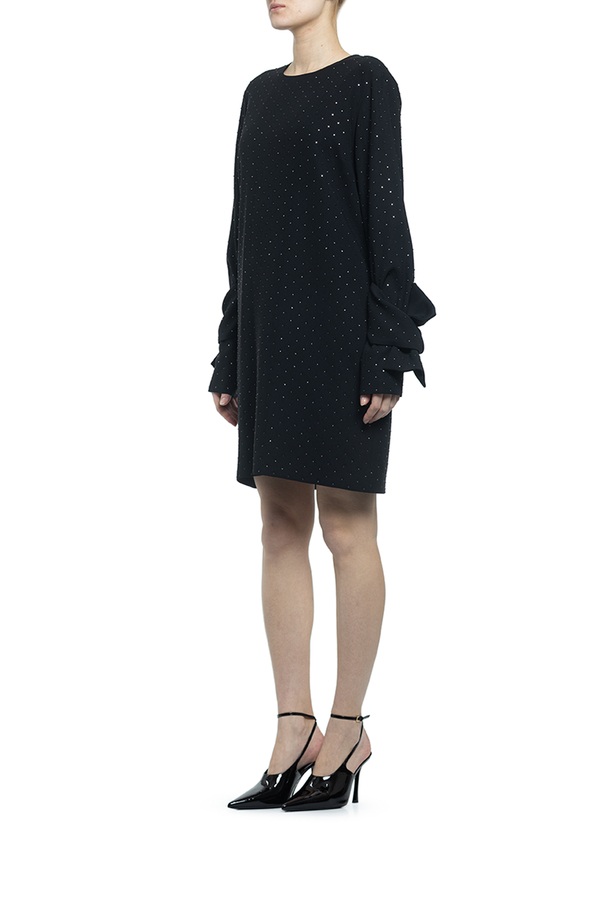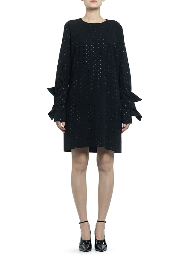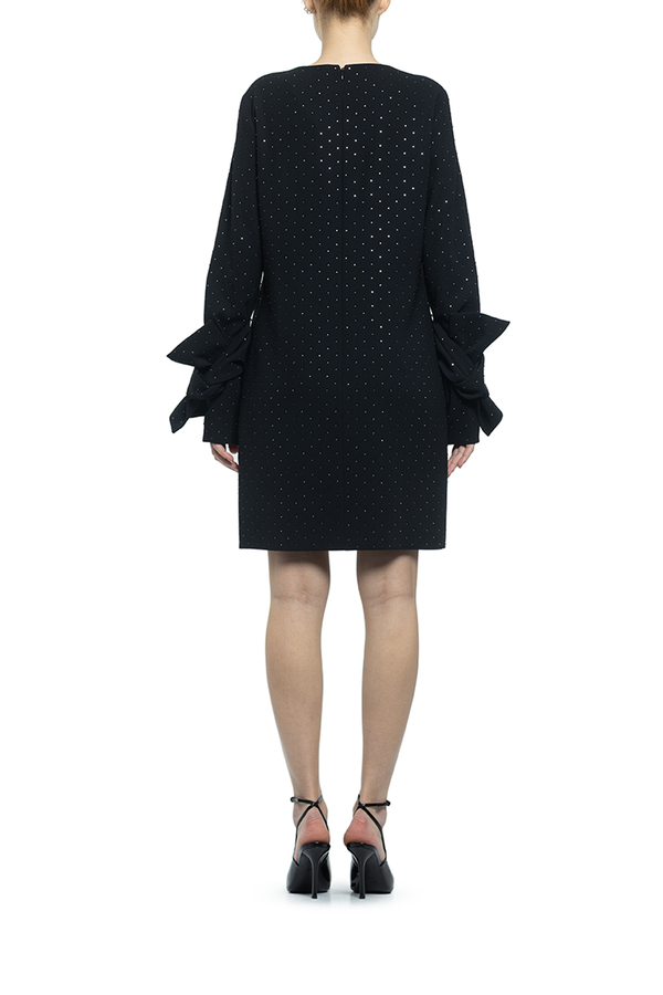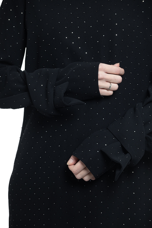 - Сукня з довгими рукавами прикрашена камінням і бантами.