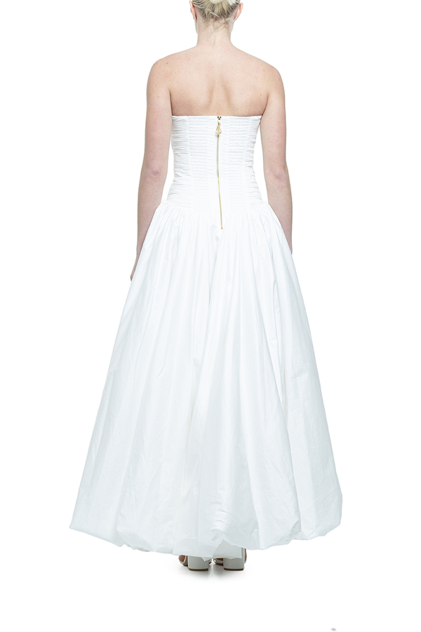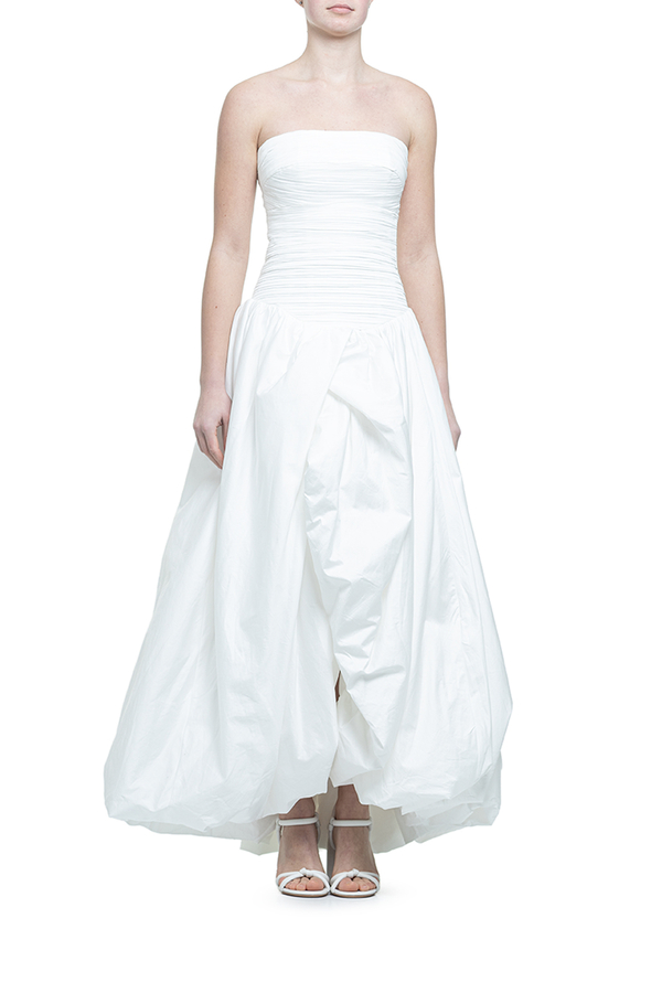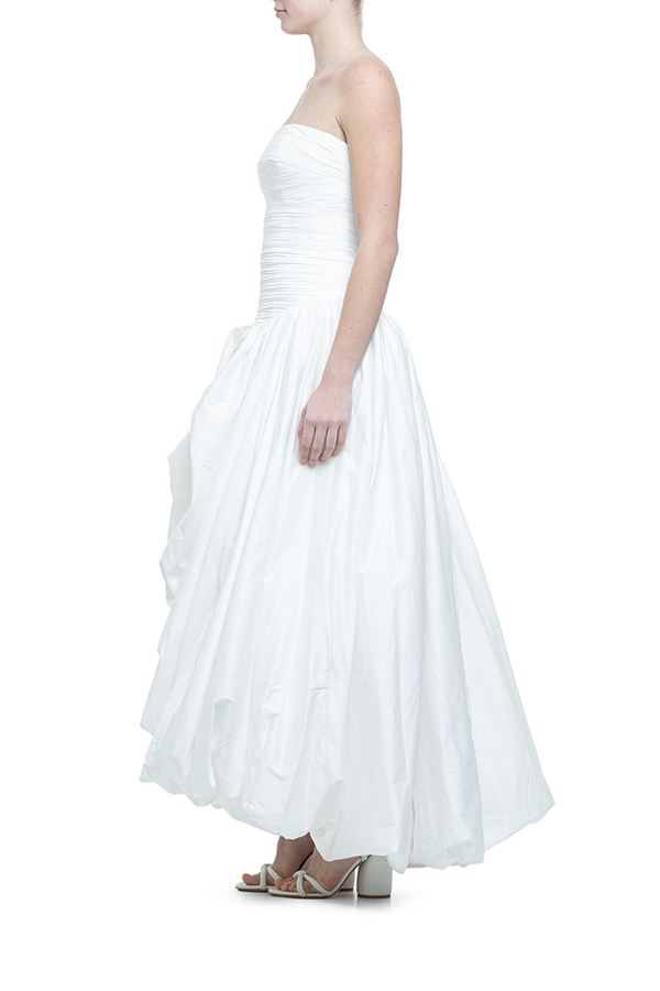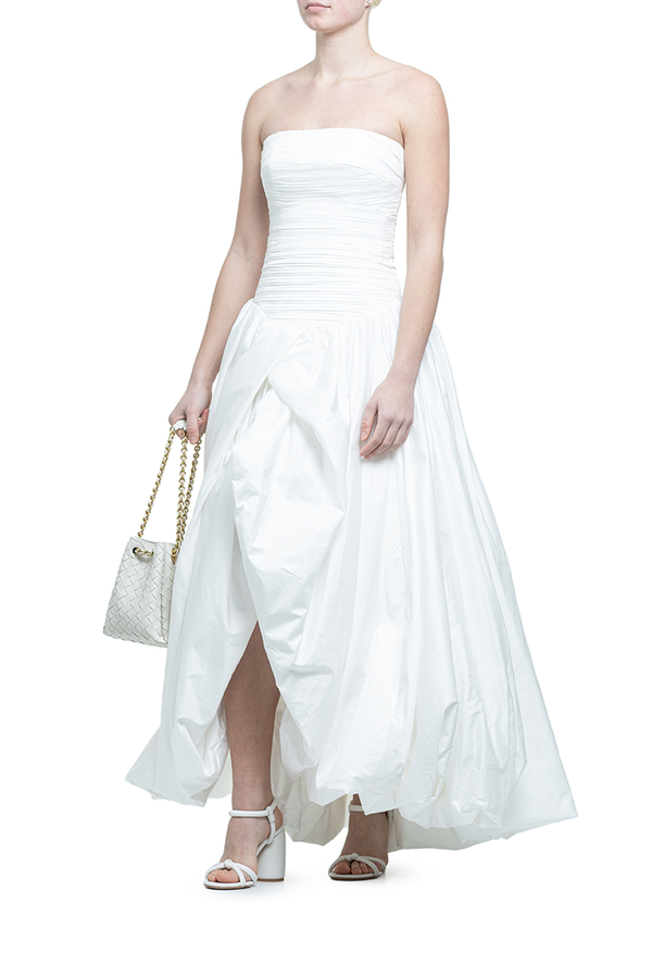 - Довга сукня, призібраний ліф у вигляді корсета, пишна спідниця з драпіруванням, асиметричний низ, застібка на золотисту блискавку ззаду
