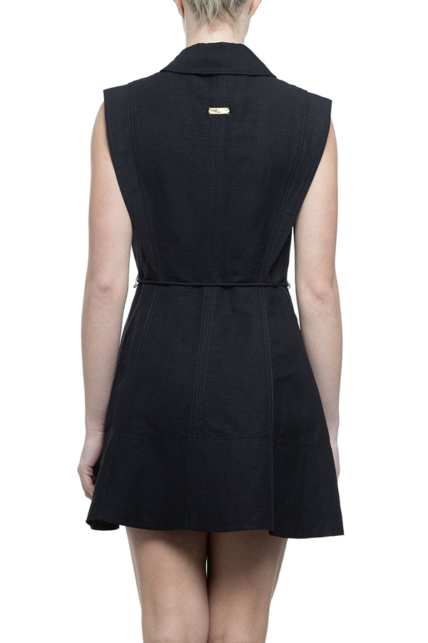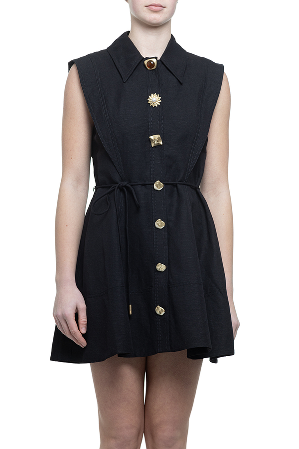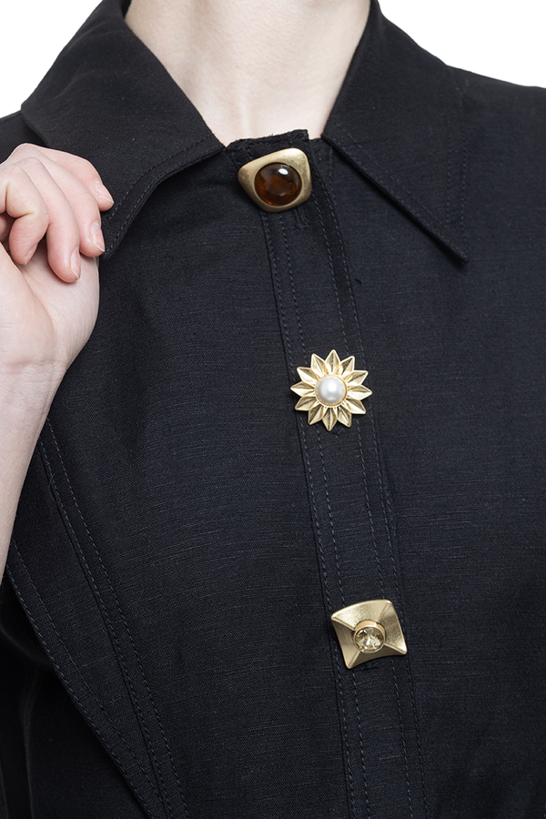 - Жіноча міні-сукня на підкладці, комір-сорочка, потайна внутрішня планка на гудзиках, зовнішня планка із золотистими декоративними гудзиками, знімний пояс-рулон із металевими наконечниками, металева пластина на спині з логотипом