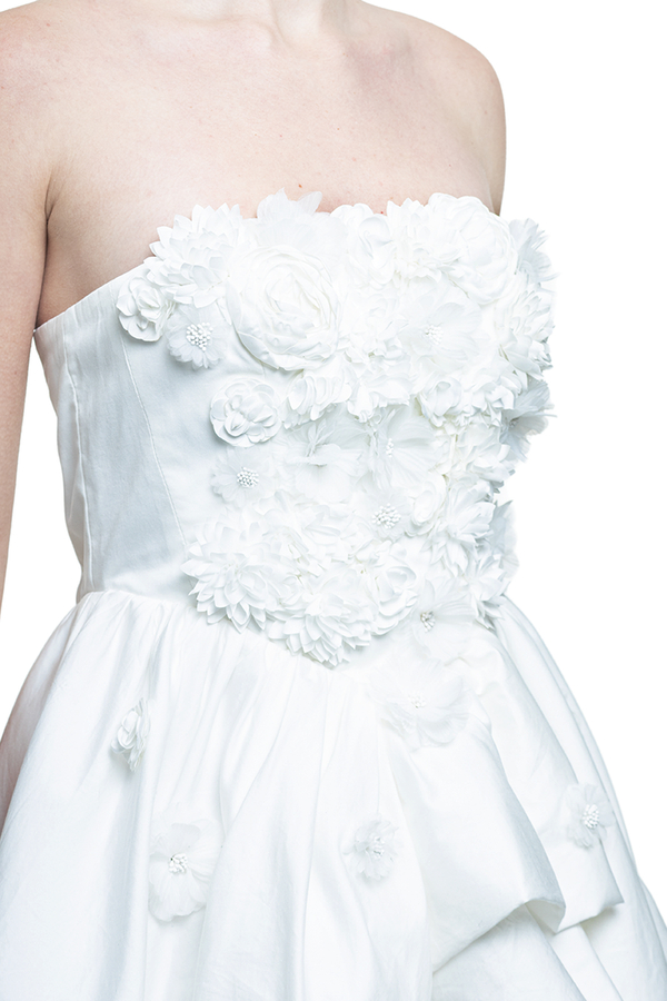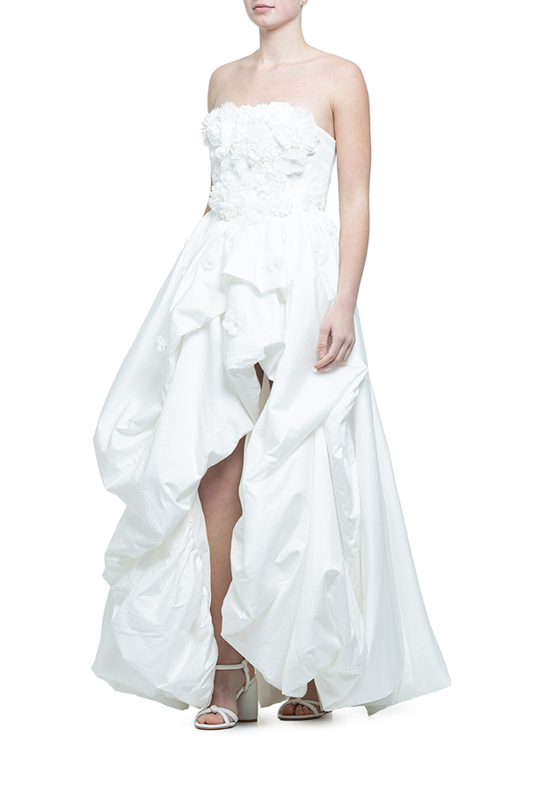 - Довга сукня без бретелів, ліф у вигляді корсета, поверхня декорована об'ємними текстильними квітами, асиметрична багатошарова спідниця з каскадним драпіруванням, високий виріз спереду, на спині застібка-блискавка