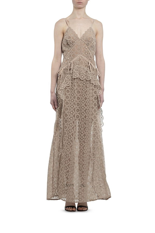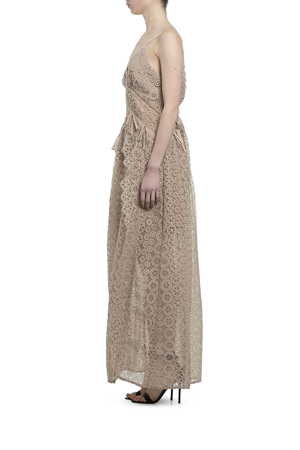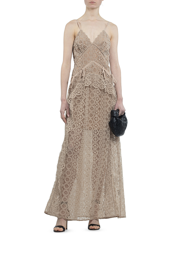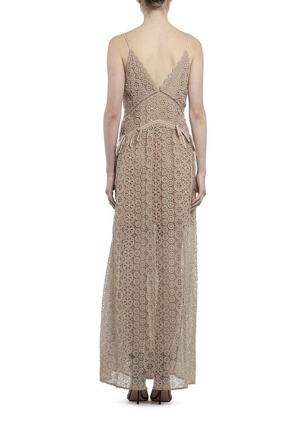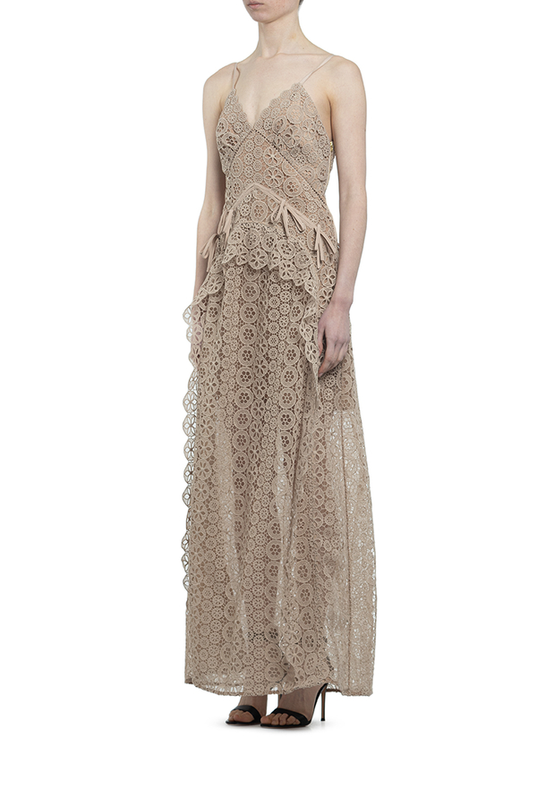 - Мереживна довга сукня на тонких брителях із квітковим візерунком. V-подібна горловина, тонкі лямки-спагетті, V-подібний виріз на спині, застібка на блискавці збоку.