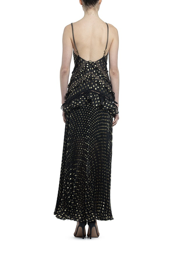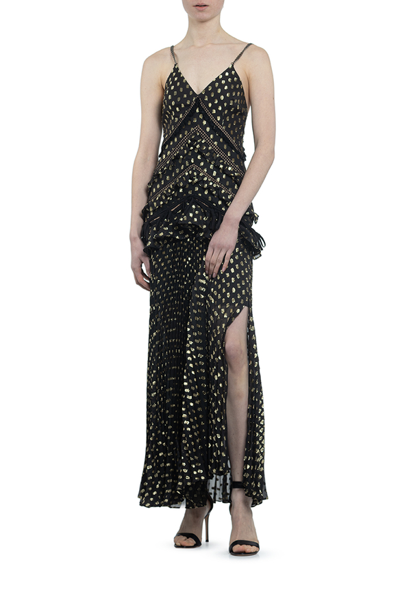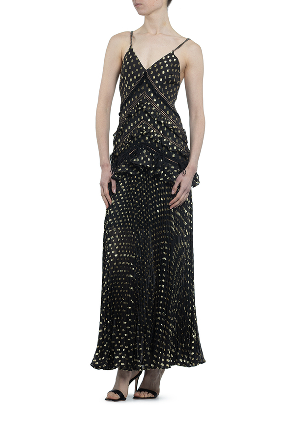 - Довга плісірована сукня на тонких брителях-ланцюжках. Принт з золотими плямами.