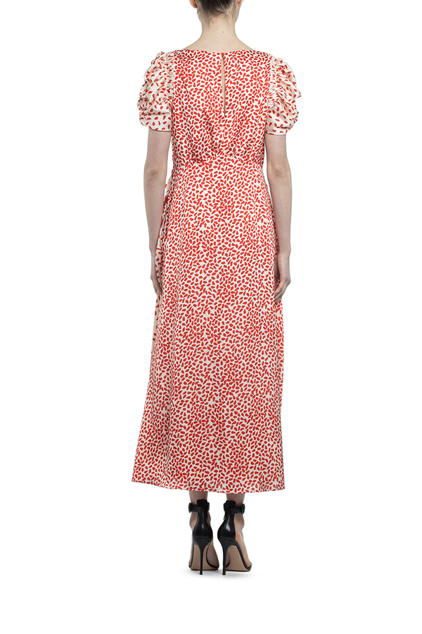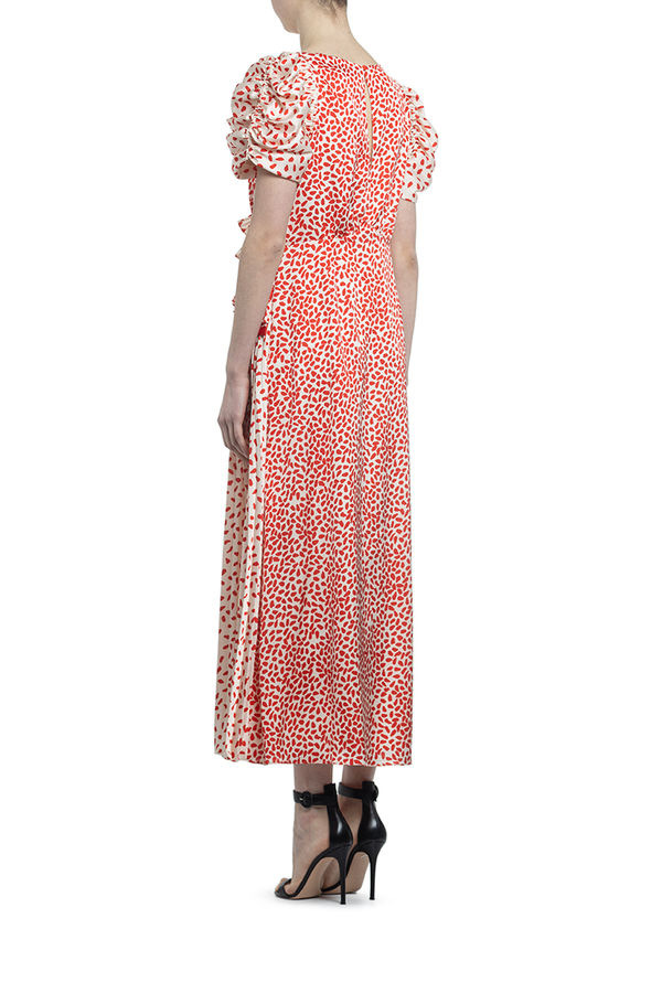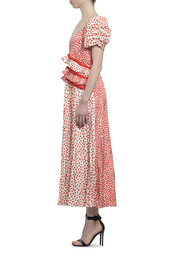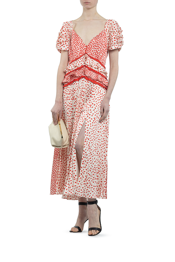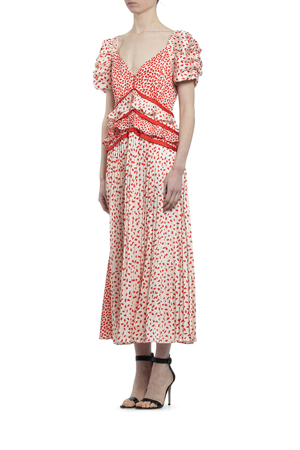 - Довга сукня з короткими рукавами і принтом в червоні цятки. Спідниця плісе з оборками на талії. Глибокий V-подібний виріз.