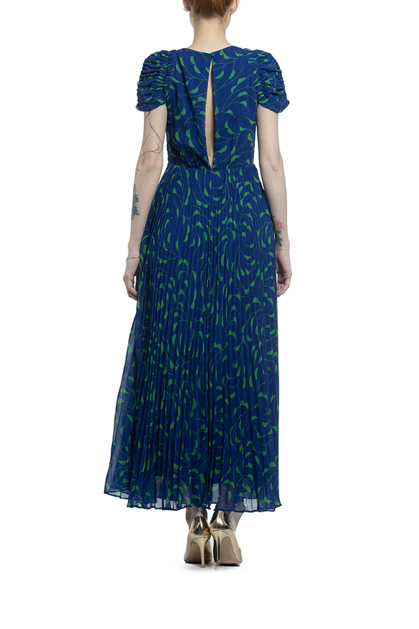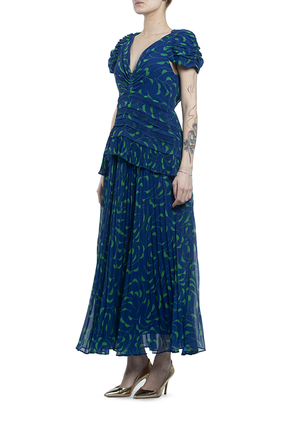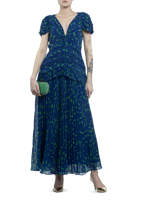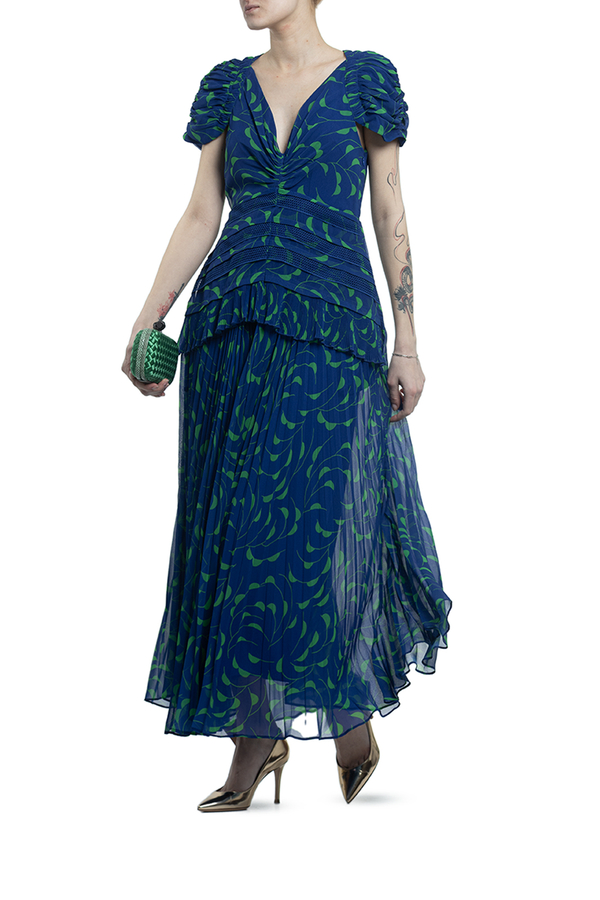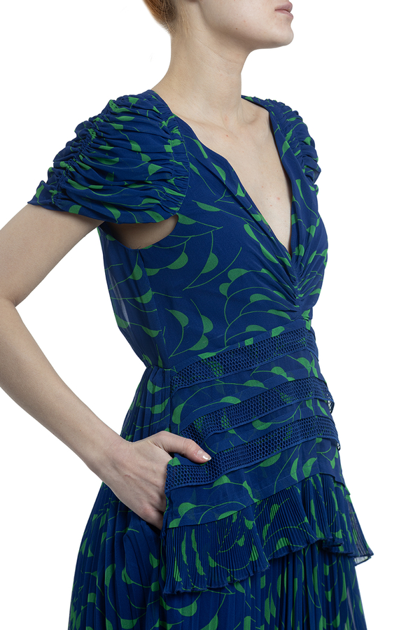 - Довга сукня с принтом зеленого лисття. Короткі драпіровані рукава, глибокий V-подібний виріз горловини, багатошарові сборки навколо налії і плісірована спідниця. Глибокий виріз і застібка на гудзик ззаду.