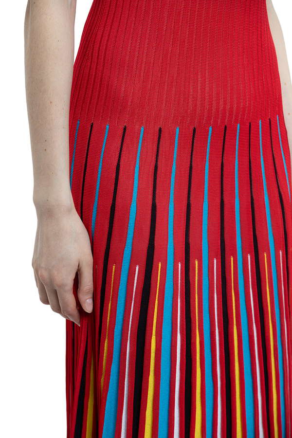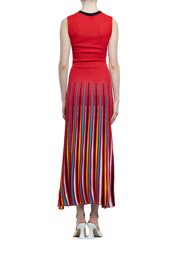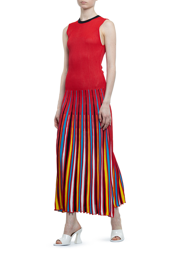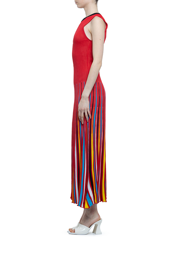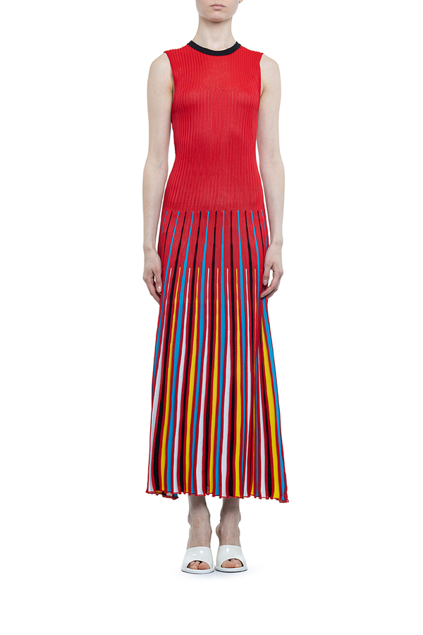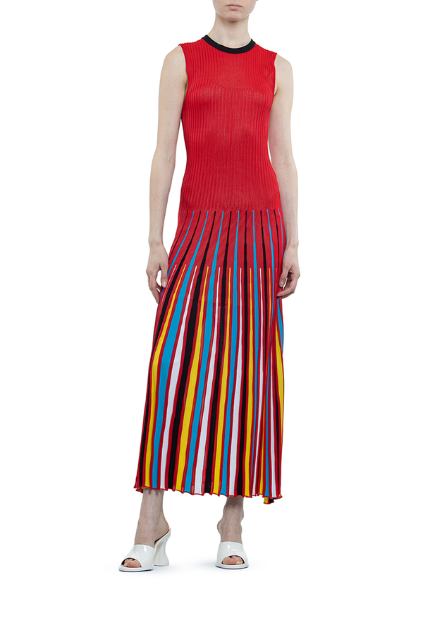 - Довга сукня без рукавів. Круглий виріз горла, спідниця різнокольоровими смужками. З трикотажної тканини в рубчик.