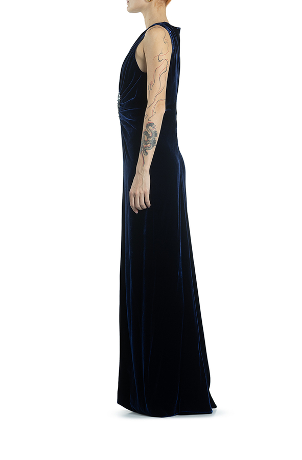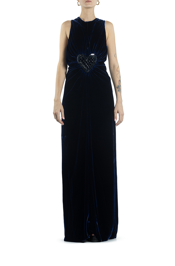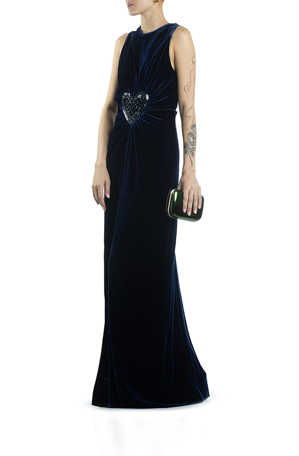 - Довга велюрова сукня без рукавів, прикрашена паєтками і бісером в формі серця.