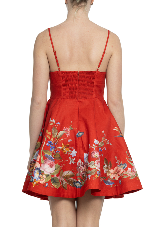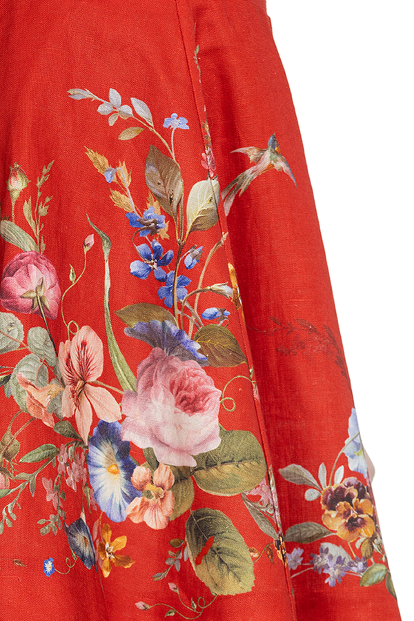 - Сукня з глибоким V-подібним вирізом, облягаючий ліф, регульовані бретелі, пишна спідниця-кльош, квітковий принт, дві бічні прорізні кишені, потаємна застібка-блискавка на спині