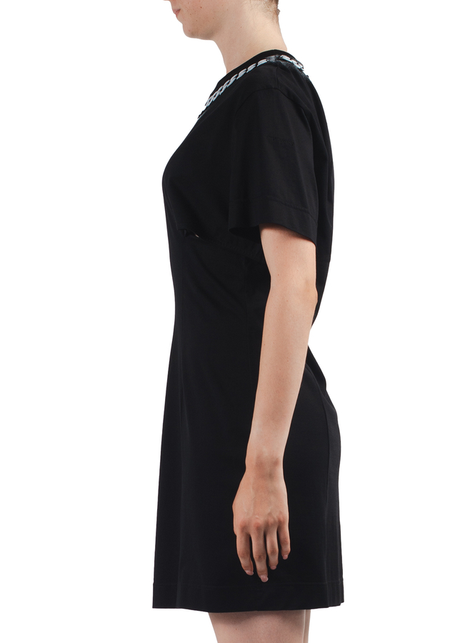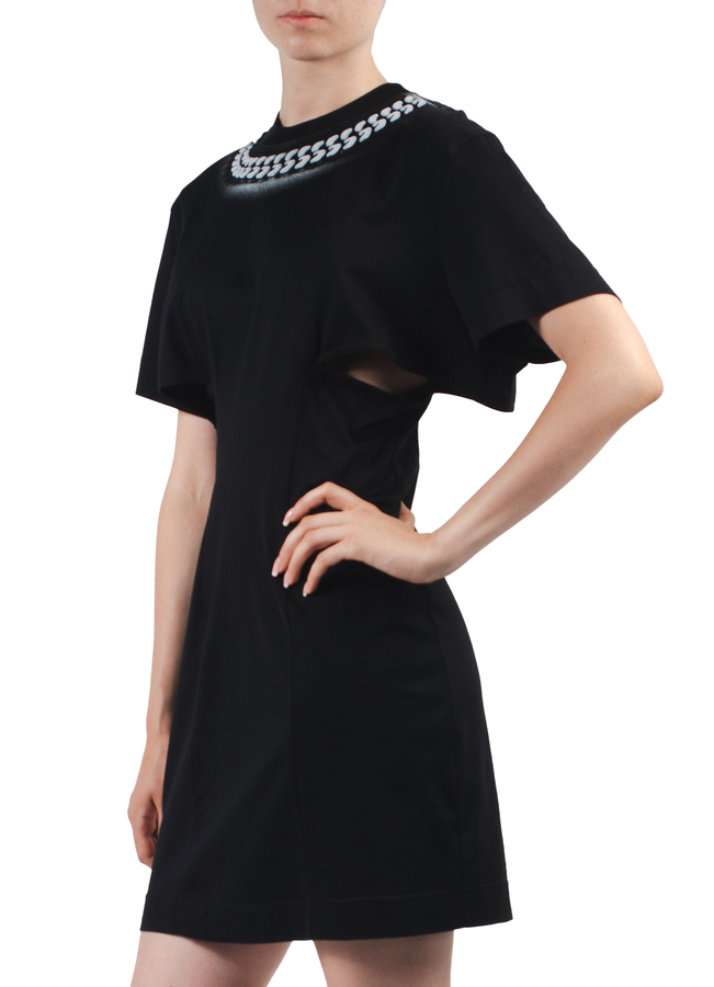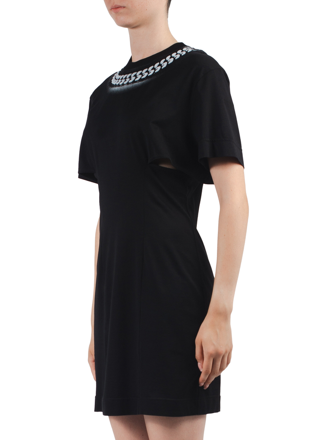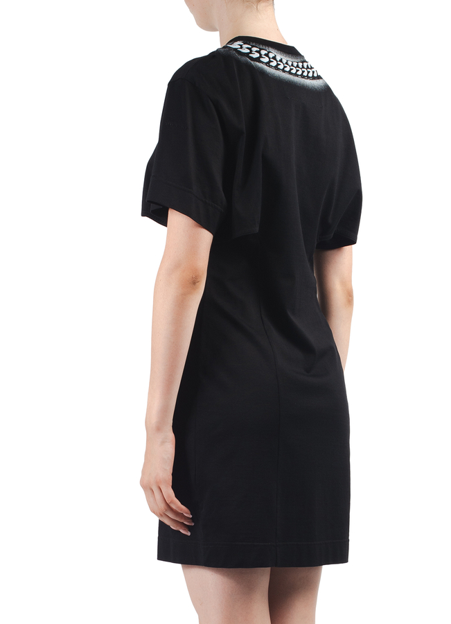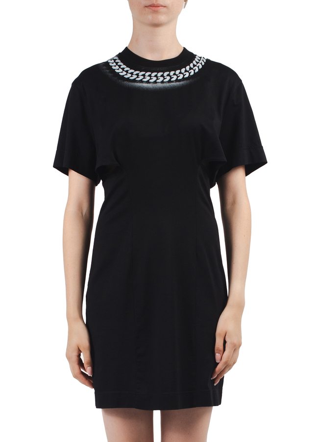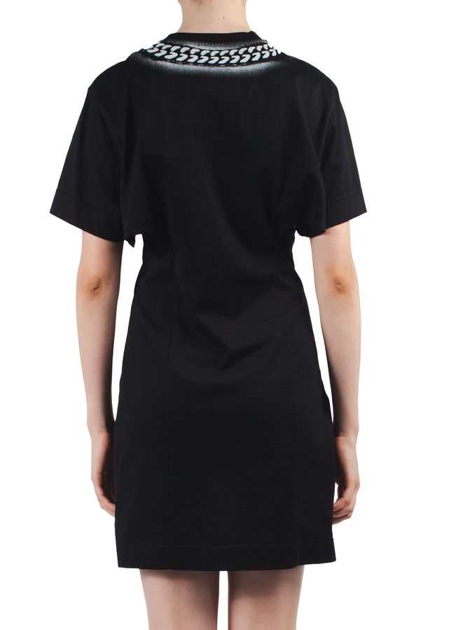 - Бавовняна сукня-футболка з короткими рукавами і принтом ланцюжка навколо горловини. Має невимушений силует і довжину до коліна.