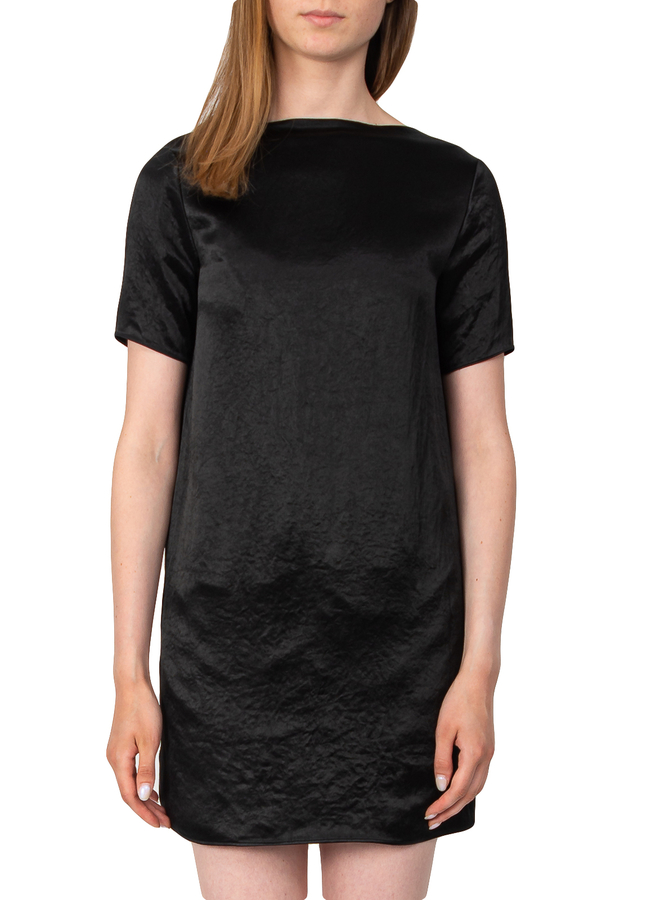 Коротка сукня, вільний крій, глибокий V-подібний виріз ззаду зі знімним металевим ланцюжком, кишені у швах, короткі рукава