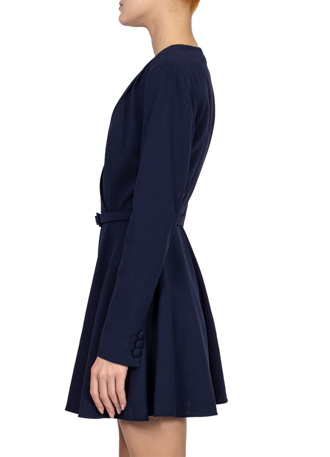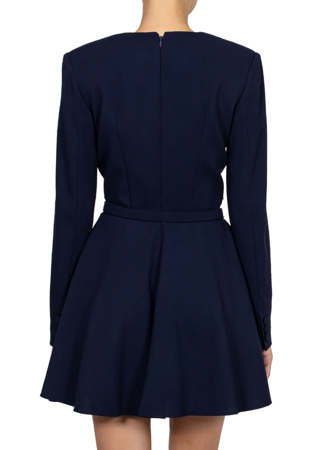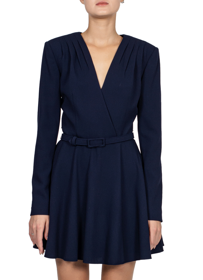 - Коротка сукня з довгими рукавами, розклешена спідниця, V-виріз спереду, деталізація плісе на плечах, ремінець на поясі, ззаду прихована застібка блискавка