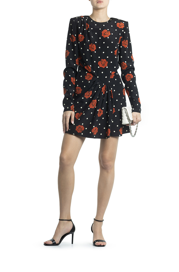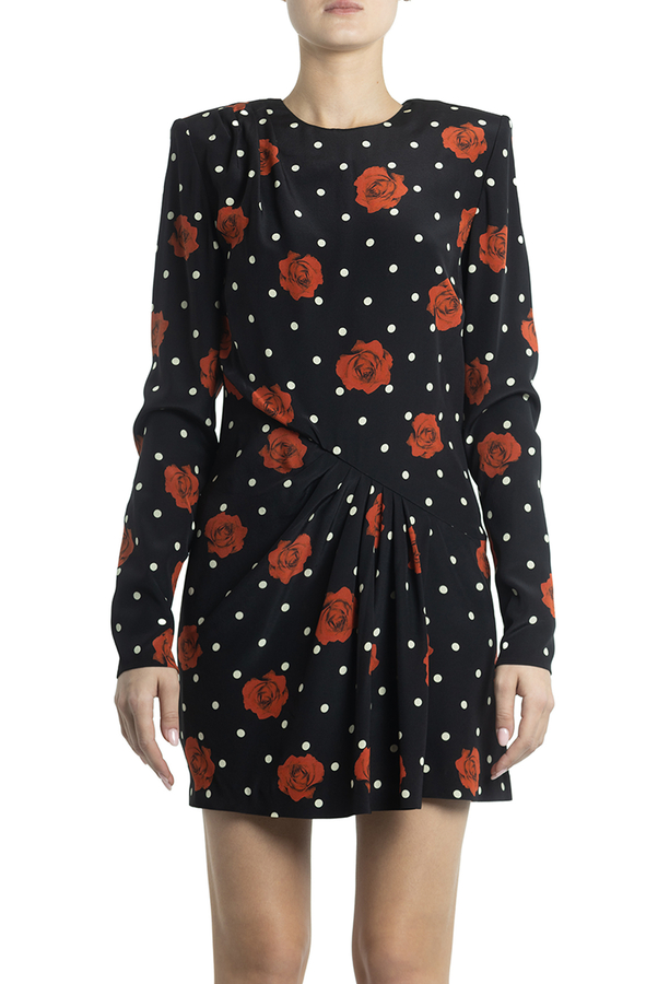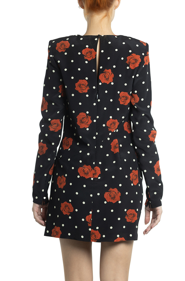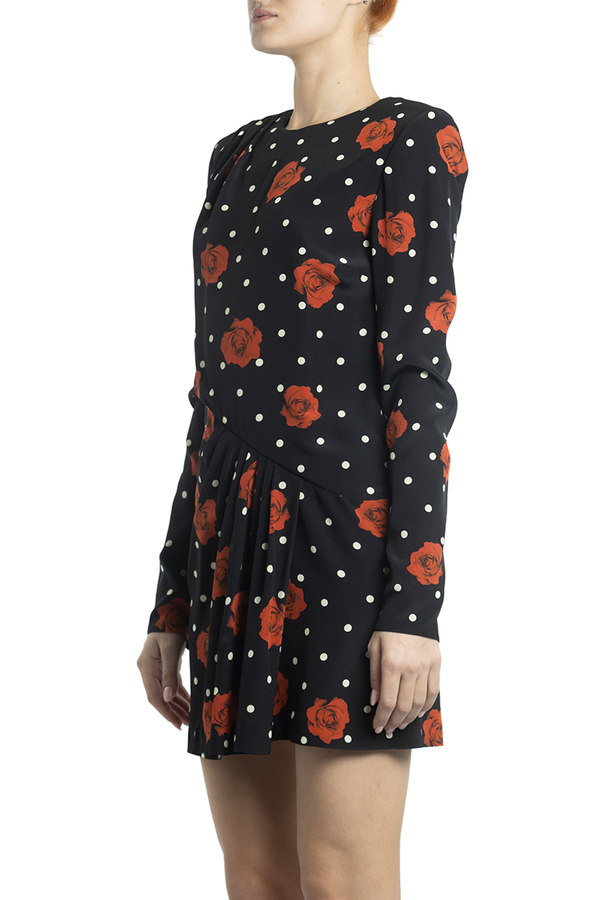 - Коротка сукня з довгими рукавами. Патерн в горох і троянди.