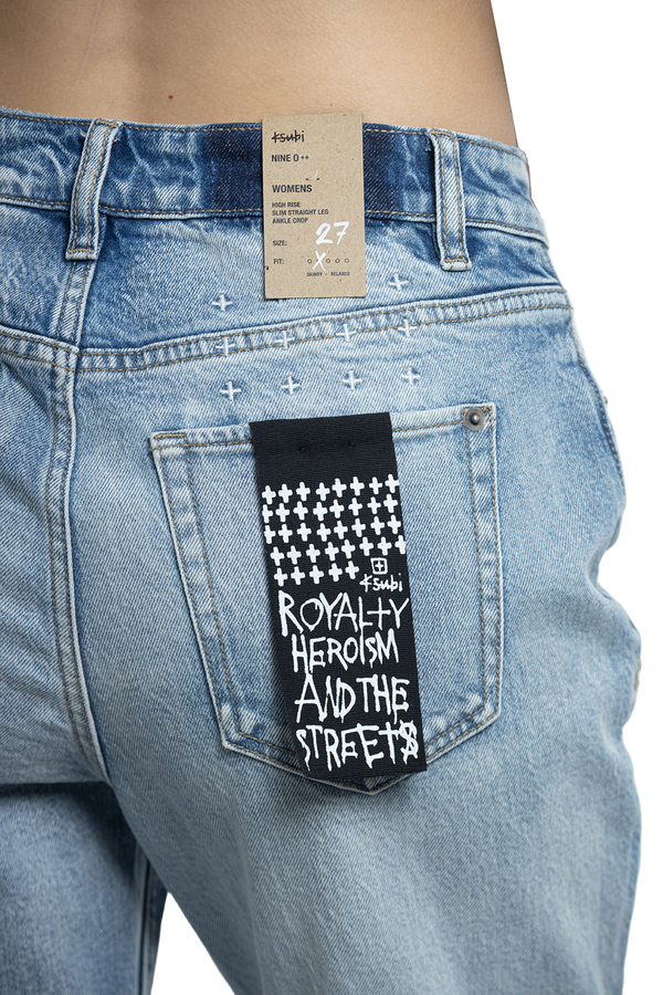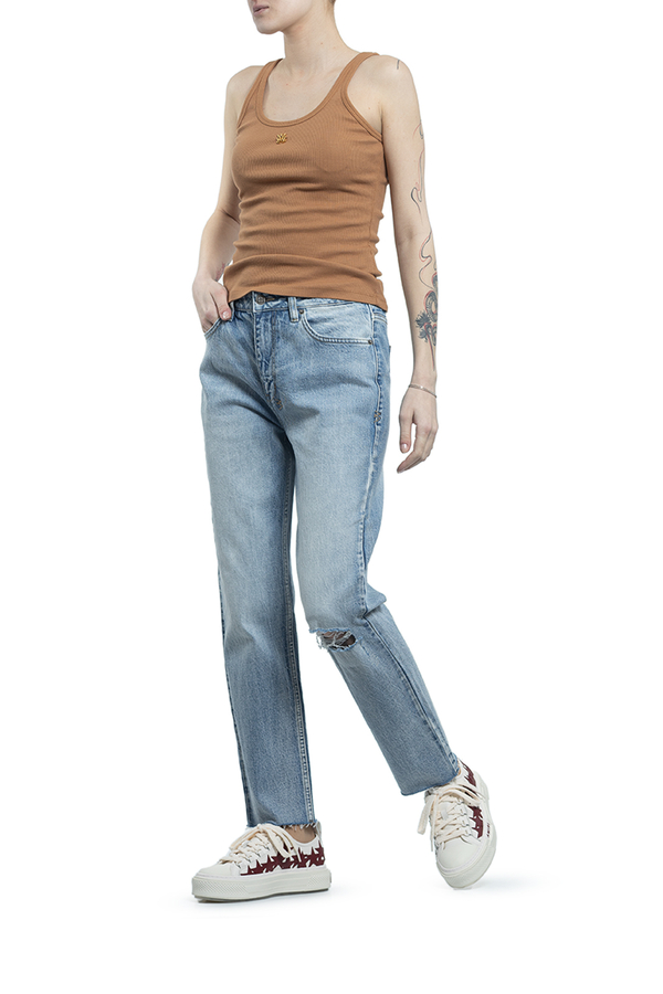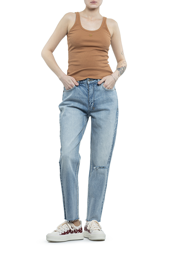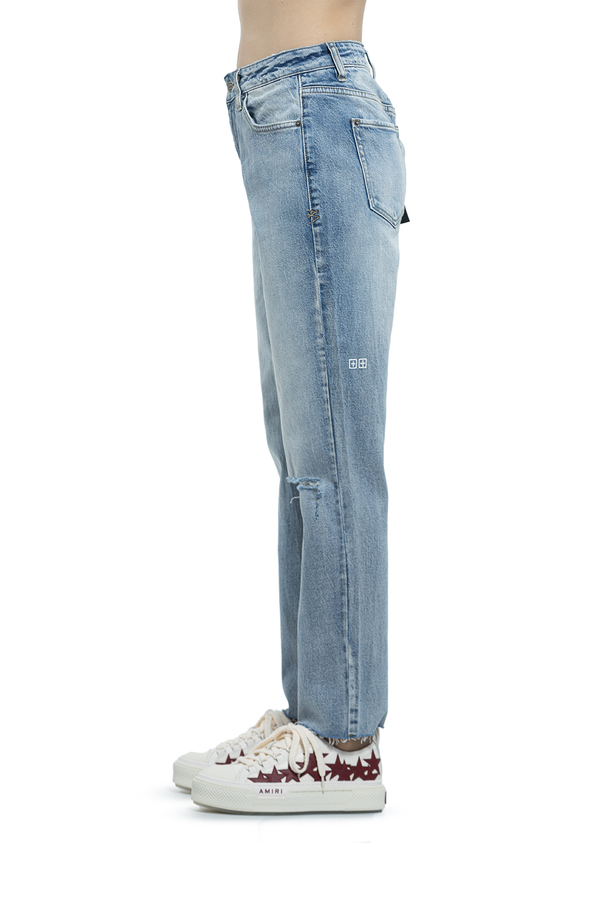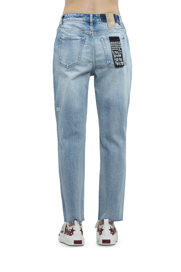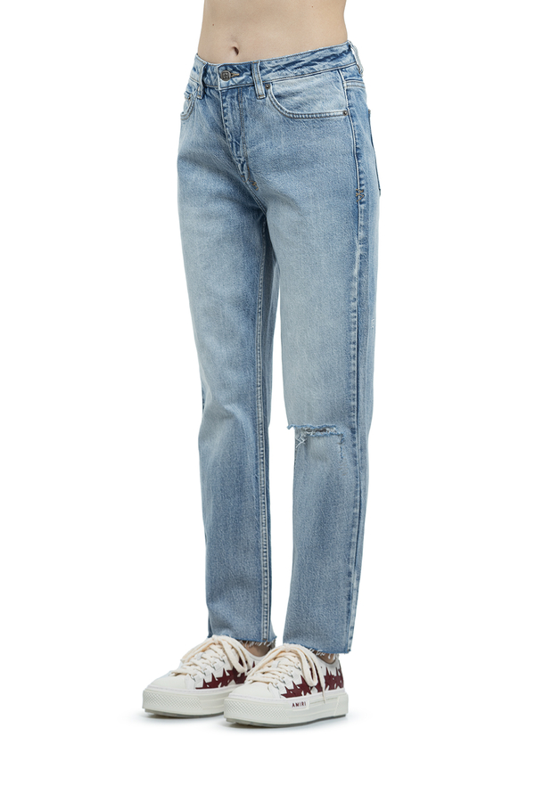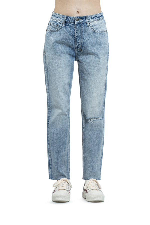 - Джинси тонкого крою. Згасаючий ефект потертостей, рвана деталізація, поясні петлі, передній гудзик і застібка на блискавку, класичні п'ять кишень.