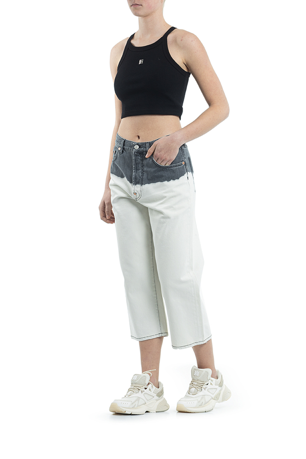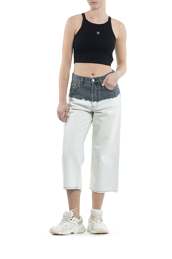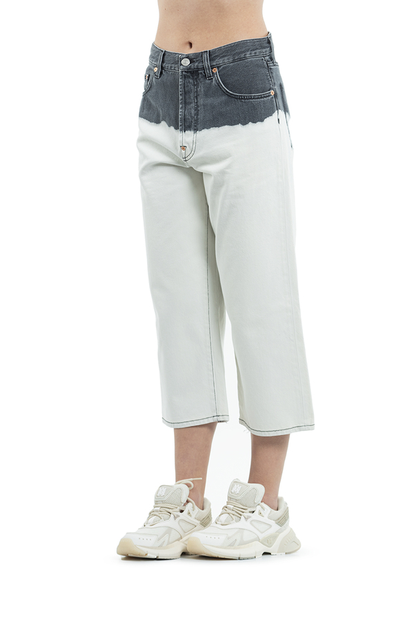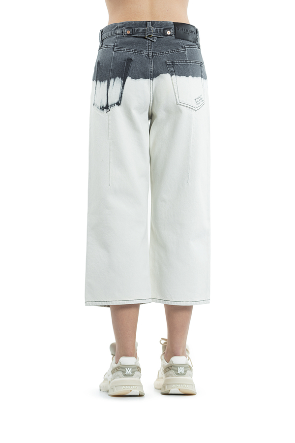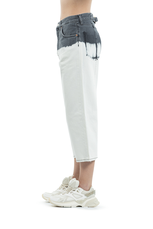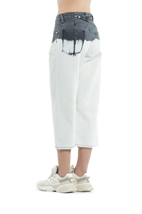 - Укорочені джинси широкого крою. Зверху сірого кольору, знизу білі. Накладні кишені ззаду, петлі для ременя. Застібка на блискавку і гудзик.