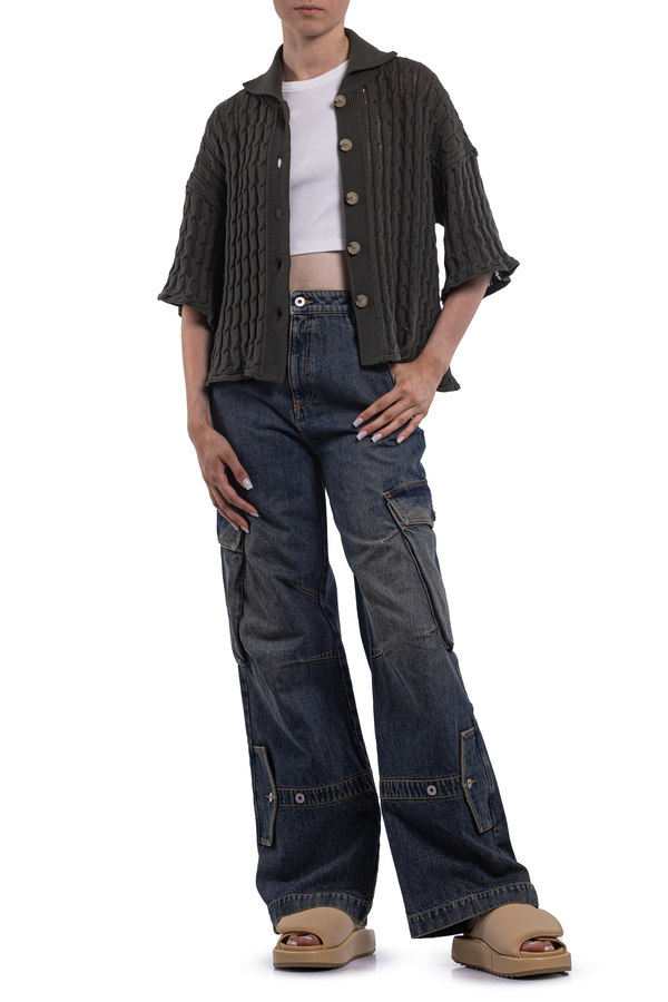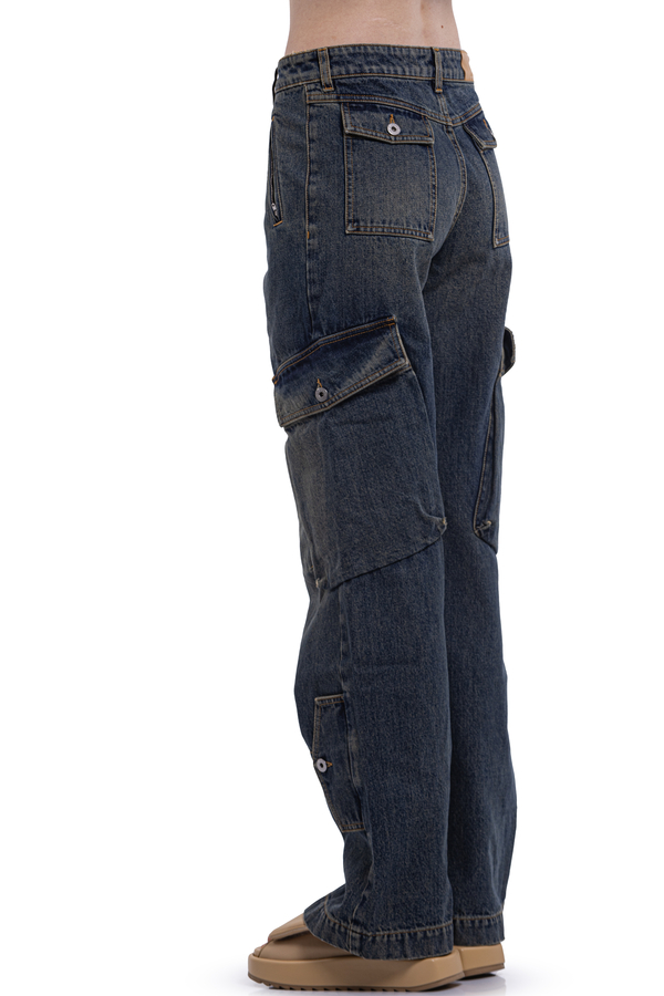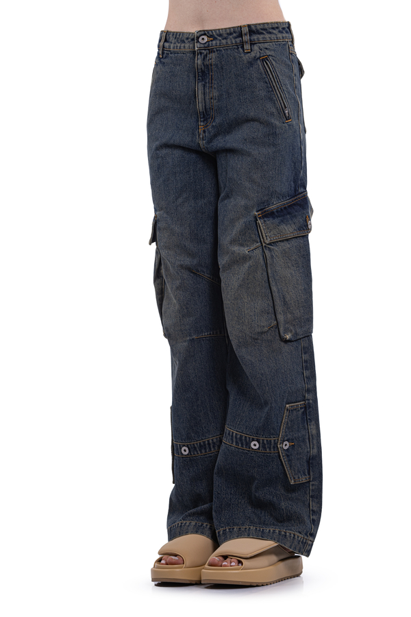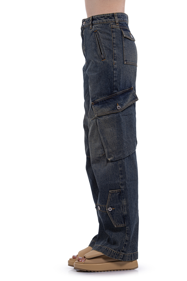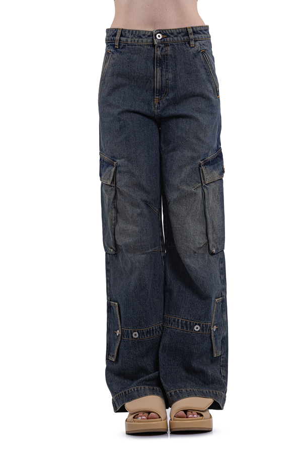 - Широкі джинси, дві прорізні та дві великі накладні кишені по боках, дві накладні кишені ззаду, застібка на гудзик